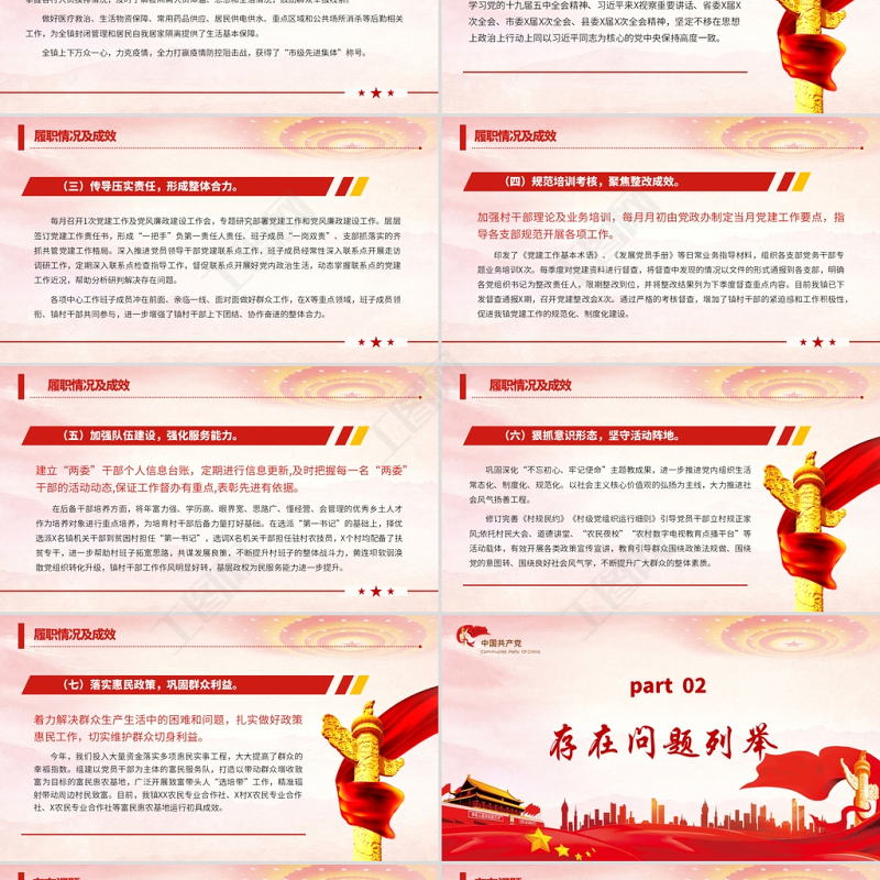 履職情況及成效加強村干部理論及業務培訓,每月月初由黨政辦制定當月黨建工作要點,指導各支部規范開展各項工作。印發了《黨建工作基本術語》、《發展黨員手冊》等日常業務指導材料,組織各支部黨務干部專題業務培訓X次。每季度對黨建資料進行督查,將督查中發現的情況以文件的形式通報到各支部,明確各黨組織書記為整改責任人,限期整改到位,并將整改結果列為下季度督查重點內容。目前我鎮已下發督查通報X期,召開黨建整改會X次。通過嚴格的考核督查,增加了鎮村干部的緊迫感和工作積極性,促進我鎮黨建工作的規范化、制度化建設。(四)規范培訓考核,聚焦整改成效。