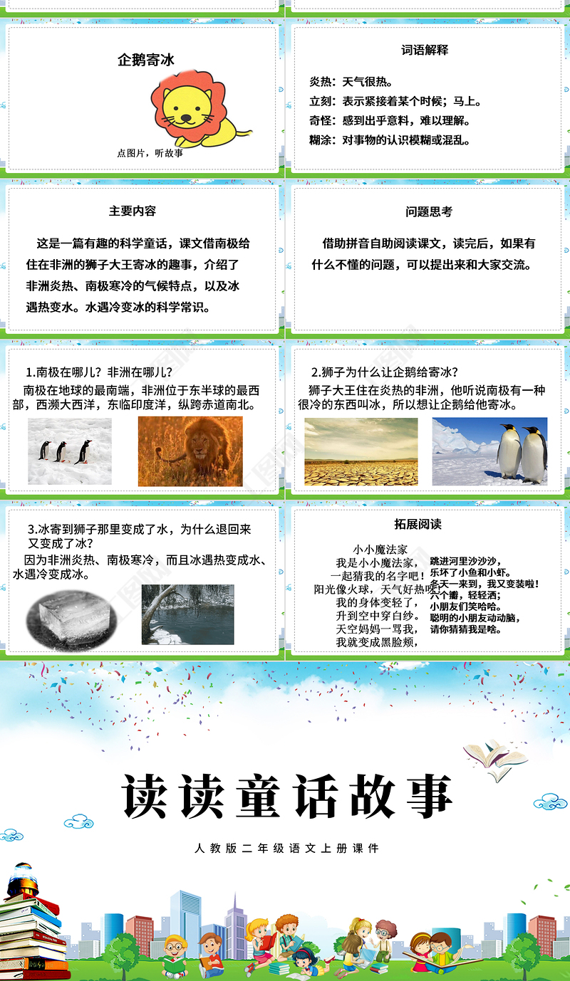 這是一篇有趣的科學童話,課文借南極給住在非洲的獅子大王寄冰的趣事,介紹了非洲炎熱、南極寒冷的氣候特點,以及冰遇熱變水。水遇冷變冰的科學常識。主要內容