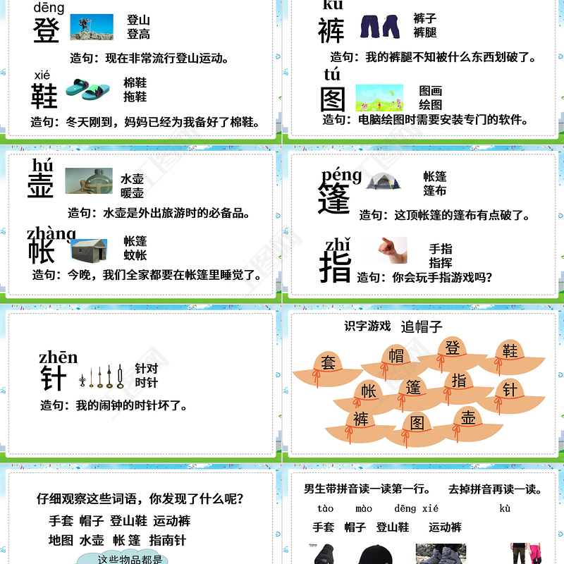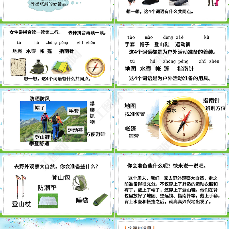 手套 帽子 登山鞋 運動褲 tào mào dēnɡ xié kù地圖 水壺 帳 篷 指南針 tú hú zhànɡ pénɡ zhǐ zhēn這4個詞語都是為戶外活動準備的著裝。這4個詞語是為戶外活動準備的用具。