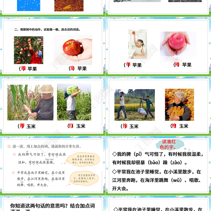 二、觀察圖中的動作,試著做一做。選合適的詞語。( )蘋果( )蘋果摘拿