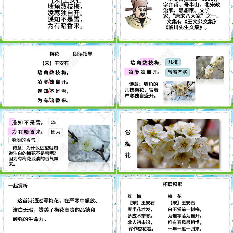 紅 梅【宋】王安石春半花才發,多應不奈寒。北人初未識, 渾作杏花看。梅 花【宋】王安石白玉堂前一樹梅,為誰零落為誰開。唯有春風最相惜,一年一度一歸來。拓展積累