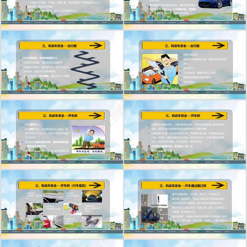 三、機動車安全---出行前出行前應當隨身攜帶機動車駕駛證;檢查車輛安全技術性能:輪胎、喇叭、刮水器、后視鏡和燈光等裝置,不得駕駛有安全隱患的機動車輛;服用精神藥品或者麻醉藥品,或者患有妨礙安全駕駛機動車的疾病,或者睡眠不足、過度疲勞,影響安全駕駛的,不得駕駛機動車;