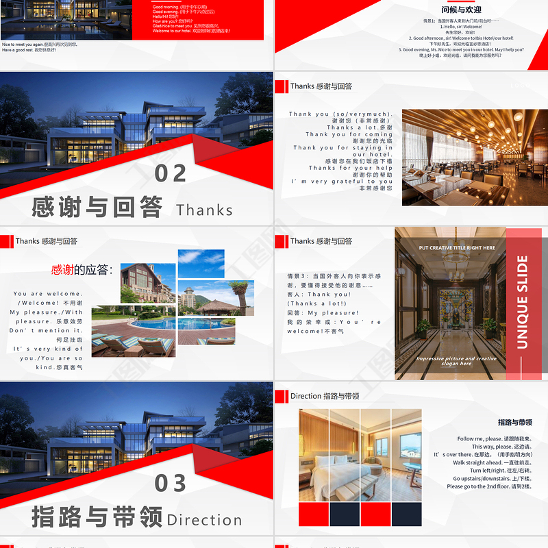Thanks 感謝與回答UNIQUE SLIDEPUT CREATIVE TITLE RIGHT HEREImpressive picture and creative slogan here情景3:當(dāng)國(guó)外客人向你表示感謝,要懂得接受他的謝意……客人:Thank you! (Thanks a lot!)回答:My pleasure!我的榮幸或:You’re welcome!不客氣
