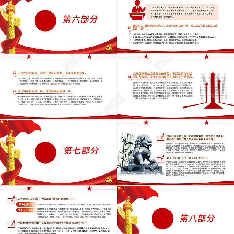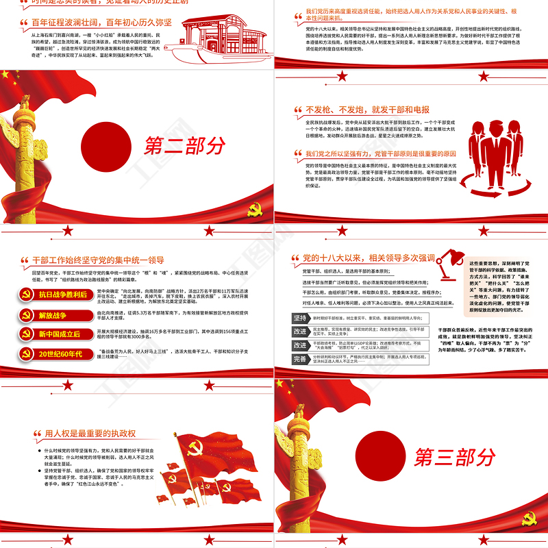<p>此模板版權為辦圖網網所有!提示:此PPT為盜版辦圖網網模板,如下載使用,會因兼容問題導致軟件崩潰,請勿下載!!!此模板版權為辦圖網網所有!提示:此PPT為盜版辦圖網網模板,如下載使用,會因兼容問題導致軟件崩潰,請勿下載!!!中國共產黨制度特色</p><br><p>第一部分</p><br><p>25.5萬個駐村工作隊300多萬名第一書記和駐村干部200萬名鄉鎮干部和數百萬村干部奮戰在脫貧攻堅一線歷經8年奮戰近1億農村貧困人口全部脫貧832個貧困縣全部摘帽千百年來困擾中華民族的絕對貧困問題歷史性畫上句號。</p><br><p>“生命至上,人民至上”,黨中央一聲令下,各級黨組織和黨員干部沖鋒在前、英勇奮戰,醫務工作者白衣執甲、逆行出征,人民解放軍指戰員聞令即動、勇挑重擔,廣大社區工作者、公安干警、基層干部、志愿者不懼風雨、堅守一線,取得抗擊疫情斗爭重大戰略成果,創造了人類同疾病斗爭史上又一個英勇壯舉。從上海石庫門到嘉興南湖,一艘“小小紅船”承載著人民的重托、民族的希望,越過急流險灘,穿過驚濤駭浪,成為領航中國行穩致遠的“巍巍巨輪”,創造世所罕見的經濟快速發展和社會長期穩定“兩大奇跡”,中華民族實現了從站起來、富起來到強起來的偉大飛躍。</p><br><p>在眾多解答中,堅持德才兼備、選賢任能的制度優勢,無疑是一個重要而耀眼的密碼。黨的干部是黨和國家事業的中堅力量。黨領導的偉大事業要取得勝利,不但要堅持正確的路線和綱領,而且要有一條正確的組織路線,要有一支堅決貫徹執行黨的路線方針政策的高素質干部隊伍。黨的十八大以來,相關領導總書記從堅持和發展中國特色社會主義的戰略高度,開創性地提出新時代黨的組織路線,圍繞培養選拔黨和人民需要的好干部,提出一系列選人用人新理念新思想新要求,為做好新時代干部工作提供了根本遵循和方法指南,指導推動選人用人制度發生深刻變革,豐富和發展了馬克思主義黨建學說,彰顯了中國特色選賢任能的制度自信和制度優勢。</p><br><p>第二部分</p><br><p>全民族抗戰爆發后,黨中央從延安派出大批干部到敵后工作,一個個干部變成一個個革命的火種,迅速填補國民黨軍隊潰退后留下的空白,建立發展壯大抗日根據地,發動群眾開展敵后游擊戰,星星之火速成燎原之勢。黨的領導是中國特色社會主義最本質的特征,是中國特色社會主義制度的最大優勢。黨是最高政治領導力量,黨管干部是干部工作的根本原則。毫不動搖地堅持黨管干部原則,貫穿干部隊伍建設全過程,為鞏固和加強黨的領導提供了堅強組織保證。</p><br><p>回望百年黨史,干部工作始終堅守黨的集中統一領導這個“根”和“魂”,緊緊圍繞黨的戰略布局、中心任務選賢任能,書寫了“組織路線為政治路線服務”的精彩篇章。黨中央確定“向北發展,向南防御”戰略方針,派出2萬名干部和11萬軍隊迅速開往東北,“走出城市,丟掉汽車,脫下皮鞋,換上農民衣服”,深入農村開展土改運動、建立新根據地,為解放東北奠定堅實基礎。由北向南推進,征調5.3萬名干部隨軍南下,為有效接管新解放區地方政權提供干部人才支撐。開展大規模經濟建設,抽調16萬多名干部到工業部門,其中選調到156項重點工程的領導干部就有3000多名。“備戰備荒為人民,好人好馬上三線”,選派大批骨干工人、干部和知識分子支援三線建設……</p><br><p>黨管干部、組織選人,是選用干部的基本原則;選拔干部當然要廣泛聽取意見,但必須發揮黨組織領導和把關作用;干部怎么用,由組織部門考察,聽取群眾意見,黨委集體決定,按程序辦;對任人唯親、任人唯利等問題,必須下決心加以整治,使用人之風真正純潔起來。這些重要思想,深刻闡明了黨管干部的科學依據、政策措施、方式方法,科學回答了“誰來把關”“把什么關”“怎么把關”等重大問題,有力扭轉了一些地方、部門黨的領導弱化淡化虛化的問題,使黨管干部原則綻放出更加奪目的光芒。新時期好干部標準,樹立重實干、重實績、重基層的鮮明用人導向;民主推薦,實現有質量、講實效的民主;改進競爭性選拔,引導干部在實干、實績上競爭;干部政績考核,防止簡單以GDP論英雄;改進推薦考察方式,不搞“大會海推”“劃票打勾”,代之以深入調研;分析研判和動議環節,嚴格執行民主集中制;開展選人用人專項巡視,堅決糾正選人用人不正之風……干部群眾普遍反映,近些年來干部工作最突出的成效,就是旗幟鮮明加強黨的領導,堅決糾正“四唯”取人偏向,干部不再為“票”為“分”為年齡而糾結,少了心浮氣躁、多了踏實苦干。</p><br><p>什么時候黨的領導堅強有力,黨和人民需要的好干部就會大量涌現;什么時候黨的領導被削弱,選人用人不正之風就會滋生蔓延。堅持黨管干部、組織選人,確保了黨和國家的領導權牢牢掌握在忠誠于黨、忠誠于國家、忠誠于人民的馬克思主義者手中,確保了“紅色江山永遠不變色”。</p><br><p>第三部分</p><br><p>這首相關領導任福州市委書記時直抒胸臆、親自填詞的《念奴嬌·追思焦裕祿》,深情描繪了一位黨的好干部的光輝形象。是一粒種子,釋放榜樣力量;是一面旗幟,引領奮進方向。一個政黨、一個國家能不能不斷培養選拔出優秀的執政骨干,很大程度上決定著這個政黨、這個國家的興衰存亡。</p><br><p>我們黨歷來高度重視樹立鮮明用人導向,嚴格堅持選人用人標準。**