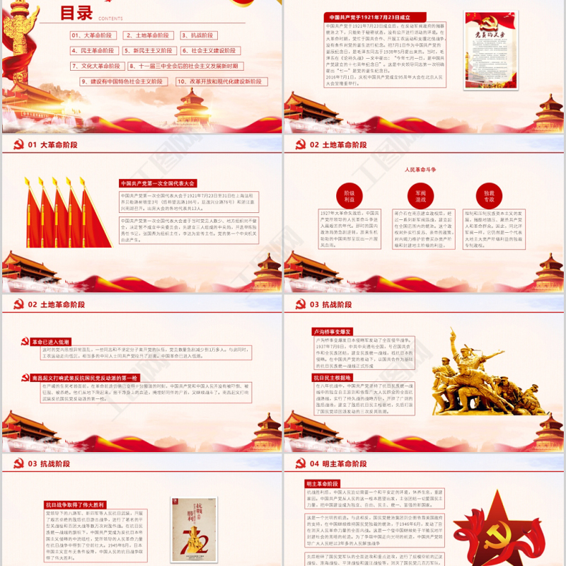 目錄01、大革命階段 2、土地革命階段 3、抗戰(zhàn)階段 4、民主革命階段 5、新民主主義階段 6、社會(huì)主義建設(shè)階段 7、文化大革命階段 8、十一屆三中全會(huì)后的社會(huì)主義發(fā)展新時(shí)期 10、改革開(kāi)放和現(xiàn)代化建設(shè)新階段9、建設(shè)有中國(guó)特色社會(huì)主義階段 CONTENTS