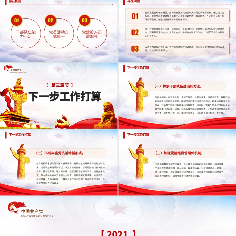 <p>基層黨建工作總結(jié)匯報(bào)人:XXX 時(shí)間:2021【 2021】</p><br><p>履職情況及成效存在問題列舉下一步工作打算010203目錄Directory</p><br><p>履職情況及成效【 第一章節(jié) 】</p><br><p>履職情況及成效今年新型冠狀病毒肺炎疫情防控期間,我鎮(zhèn)全體干部盡職盡責(zé),科學(xué)調(diào)度各項(xiàng)工作。落實(shí)新集鎮(zhèn)新冠病毒疫情防控網(wǎng)格化管理包保責(zé)任制和“十戶聯(lián)保”責(zé)任制,及時(shí)傳達(dá)市、縣、鎮(zhèn)各級(jí)政策和命令,實(shí)時(shí)掌握各村人員摸排情況,及時(shí)了解被隔離人員體溫、思想和生活情況,鼓勵(lì)群眾舉報(bào)線索。做好醫(yī)療救治、生活物資保障、常用藥品供應(yīng)、居民供電供水、重點(diǎn)區(qū)域和公共場所消殺等后勤相關(guān)工作,為全鎮(zhèn)封閉管理和居民自我居家隔離提供了生活基本保障。全鎮(zhèn)上下萬眾一心,力克疫情,全力打贏疫情防控阻擊戰(zhàn),獲得了“市級(jí)先進(jìn)集體”稱號(hào)。(一) 堅(jiān)守防控一線,保障群眾健康。</p><br><p>履職情況及成效嚴(yán)格執(zhí)行黨委中心組學(xué)習(xí)制度,堅(jiān)持加強(qiáng)政治理論學(xué)習(xí),認(rèn)真學(xué)習(xí)黨的十九屆五中全會(huì)精神、來X視察重要講話、省委X屆X次全會(huì)、市委X屆X次全會(huì)、縣委X屆X次全會(huì)精神,堅(jiān)定不移在思想上政治上行動(dòng)上同以同志為核心的黨中央保持高度一致。(二)聚焦主責(zé)主業(yè),加強(qiáng)政治學(xué)習(xí)。</p><br><p>履職情況及成效每月召開1次黨建工作及黨風(fēng)廉政建設(shè)工作會(huì),專題研究部署黨建工作和黨風(fēng)廉政建設(shè)工作。層層簽訂黨建工作責(zé)任書,形成“一把手”負(fù)第一責(zé)任人責(zé)任、班子成員“一崗雙責(zé)”、支部抓落實(shí)的齊抓共管黨建工作格局。深入推進(jìn)黨員領(lǐng)導(dǎo)干部黨建聯(lián)系點(diǎn)工作,班子成員經(jīng)常性深入聯(lián)系點(diǎn)開展走訪調(diào)研工作,定期深入聯(lián)系點(diǎn)檢查指導(dǎo)工作,督促聯(lián)系點(diǎn)開展好黨內(nèi)政治生活,動(dòng)態(tài)掌握聯(lián)系點(diǎn)的黨建工作近況,幫助分析研判解決存在問題。各項(xiàng)中心工作班子成員沖在前面、親臨一線、面對(duì)面做好群眾工作,在X等重點(diǎn)領(lǐng)域,班子成員領(lǐng)銜、鎮(zhèn)村干部共同參與,進(jìn)一步增強(qiáng)了鎮(zhèn)村干部上下團(tuán)結(jié)、協(xié)作奮進(jìn)的整體合力。(三)傳導(dǎo)壓實(shí)責(zé)任,形成整體合力。</p><br><p>履職情況及成效加強(qiáng)村干部理論及業(yè)務(wù)培訓(xùn),每月月初由黨政辦制定當(dāng)月黨建工作要點(diǎn),指導(dǎo)各支部規(guī)范開展各項(xiàng)工作。印發(fā)了《黨建工作基本術(shù)語》、《發(fā)展黨員手冊》等日常業(yè)務(wù)指導(dǎo)材料,組織各支部黨務(wù)干部專題業(yè)務(wù)培訓(xùn)X次。每季度對(duì)黨建資料進(jìn)行督查,將督查中發(fā)現(xiàn)的情況以文件的形式通報(bào)到各支部,明確各黨組織書記為整改責(zé)任人,限期整改到位,并將整改結(jié)果列為下季度督查重點(diǎn)內(nèi)容。目前我鎮(zhèn)已下發(fā)督查通報(bào)X期,召開黨建整改會(huì)X次。通過嚴(yán)格的考核督查,增加了鎮(zhèn)村干部的緊迫感和工作積極性,促進(jìn)我鎮(zhèn)黨建工作的規(guī)范化、制度化建設(shè)。(四)規(guī)范培訓(xùn)考核,聚焦整改成效。</p><br><p>履職情況及成效建立“兩委”干部個(gè)人信息臺(tái)賬,定期進(jìn)行信息更新,及時(shí)把握每一名“兩委”干部的活動(dòng)動(dòng)態(tài),保證工作督辦有重點(diǎn),表彰先進(jìn)有依據(jù)。在后備干部培養(yǎng)方面,將年富力強(qiáng)、學(xué)歷高、眼界寬、思路廣、懂經(jīng)營、會(huì)管理的優(yōu)秀鄉(xiāng)土人才作為培養(yǎng)對(duì)象進(jìn)行重點(diǎn)培養(yǎng),為培育村干部后備力量打好基礎(chǔ)。在選派“第一書記”的基礎(chǔ)上,擇優(yōu)選派X名鎮(zhèn)機(jī)關(guān)干部到貧困村擔(dān)任“第一書記”,選調(diào)X名機(jī)關(guān)干部擔(dān)任駐村農(nóng)技員,X個(gè)村均配備了扶貧專干,進(jìn)一步幫助村班子拓寬思路,共謀發(fā)展良策,不斷提升村班子的整體戰(zhàn)斗力,黃連壩軟弱渙散黨組織轉(zhuǎn)化升級(jí),鎮(zhèn)村干部工作作風(fēng)明顯好轉(zhuǎn),基層政權(quán)為民服務(wù)能力進(jìn)一步提升。(五)加強(qiáng)隊(duì)伍建設(shè),強(qiáng)化服務(wù)能力。</p><br><p>履職情況及成效鞏固深化“不忘初心、牢記使命”主題教成果,進(jìn)一步推進(jìn)黨內(nèi)組織生活常態(tài)化、制度化、規(guī)范化。以社會(huì)主義核心價(jià)值觀的弘揚(yáng)為主線,大力推進(jìn)社會(huì)風(fēng)氣揚(yáng)善工程。修訂完善《村規(guī)民約》《村級(jí)黨組織運(yùn)行細(xì)則》引導(dǎo)黨員干部立村規(guī)正家風(fēng);依托村民大會(huì)、道德講堂、“農(nóng)民夜校”“農(nóng)村數(shù)字電視教育點(diǎn)播平臺(tái)”等活動(dòng)載體,有效開展各類政策宣傳宣講,教育引導(dǎo)群眾圍繞政策法規(guī)做、圍繞黨的意圖轉(zhuǎn)、圍繞良好社會(huì)風(fēng)氣學(xué),不斷提升廣大群眾的整體素質(zhì)。(六)狠抓意識(shí)形態(tài),堅(jiān)