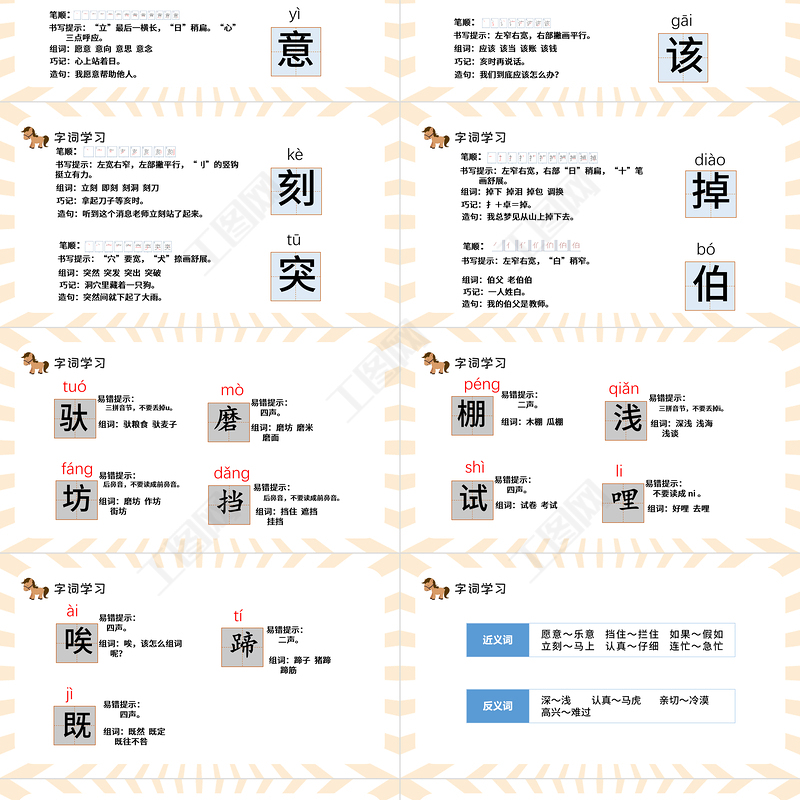 筆順:組詞:立刻 即刻 刻洞 刻刀 巧記:拿起刀子等亥時。書寫提示:左寬右窄,左部撇平行,“刂”的豎鉤挺立有力。刻造句:聽到這個消息老師立刻站了起來。kètū筆順:組詞:突然 突發(fā) 突出 突破 巧記:洞穴里藏著一只狗。書寫提示:“穴”要寬,“犬”捺畫舒展。突造句:突然間就下起了大雨。字詞學習