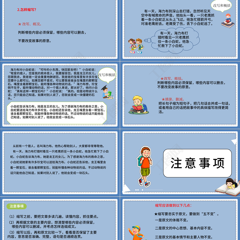 ★改寫、概括。 判斷哪些內(nèi)容必須保留,哪些內(nèi)容可以刪去,不要改變故事的原意。 ★摘錄、刪減。 把長(zhǎng)句子縮為短句子,把幾句話合并成一句話,或者用自己的話把故事中的具體描寫改得更簡(jiǎn)潔。