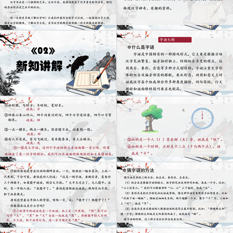 ⑤畫的是一個人(亻)靠在樹(木)旁,謎底是“休”。 ⑥畫的是一個時鐘,正好是十二點(十與兩個點),謎 底是“斗”。