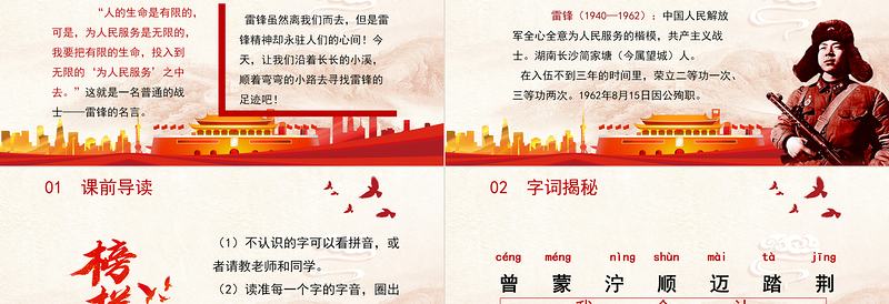 雷鋒(1940—1962):中國人民解放軍全心全意為人民服務(wù)的楷模,共產(chǎn)主義戰(zhàn)士。湖南長沙簡家塘(今屬望城)人。 在入伍不到三年的時(shí)間里,榮立二等功一次、三等功兩次。1962年8月15日因公殉職。01 課前導(dǎo)讀