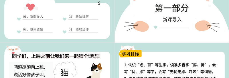 學習目標1. 認識“慮、職”等生字,讀準多音字“屏、折”,會寫“憂、慮”等字,會寫“無憂無慮、呼喚”等詞語。 2. 體會作者對貓的喜愛之情,把自己的體會有感情地讀出來。 3. 學習作者抓住貓的性格特點,有層次地敘述的方法。