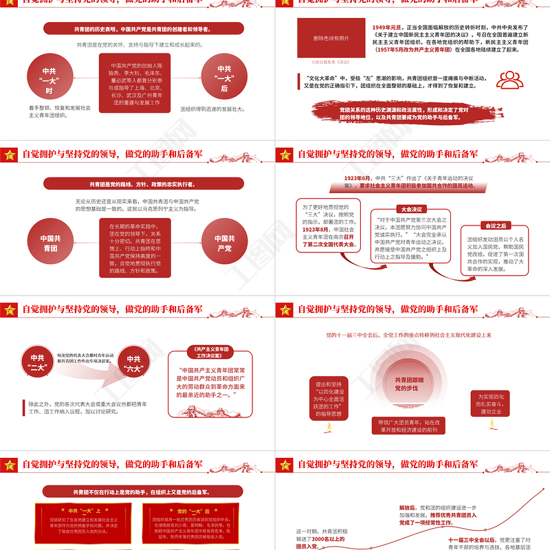 1949年元旦,正當全國面臨解放的歷史轉折時刻,中共中央發布了《關于建立中國新民主主義青年團的決議》,號召在全國普遍建立新民主主義青年團組織。在各地黨組織的幫助下,新民主主義青年團(1957年5月改為共產主義青年團)在全國各地陸續建立了起來。“文化大革命”中,受極“左”思潮的影響,共青團組織曾一度癱瘓與中斷活動,又是在黨的正確指引下,團組織在全面整頓的基礎上,才得到了恢復和建立。人民日報發表《決議》刪除色塊有照片黨團關系的這種歷史淵源和政治屬性,形成和決定了黨對團的領導地位,以及共青團要成為黨的助手與后備軍。