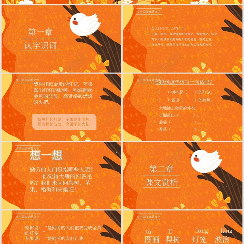 會認8個生字。會寫8個字。 正確、流利、有感情地朗讀課文。背誦課文。體會對秋天的景象和勤勞的人們的喜愛、贊美之情。 喜歡秋天,愿意用自己喜歡的方式來表現秋天。