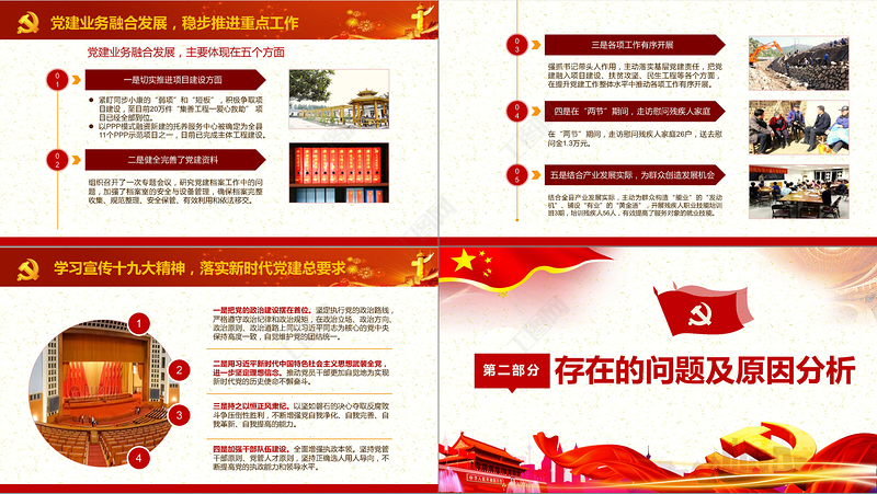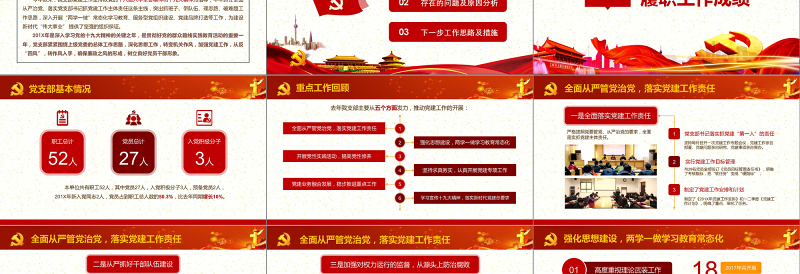 重點(diǎn)工作回顧去年我支部主要從五個(gè)方面發(fā)力,推動(dòng)黨建工作的開(kāi)展:12345全面從嚴(yán)管黨治黨,落實(shí)黨建工作責(zé)任堅(jiān)持求真務(wù)實(shí),認(rèn)真開(kāi)展黨建專項(xiàng)工作開(kāi)展黨性實(shí)踐活動(dòng),提高黨性修養(yǎng)黨建業(yè)務(wù)融合發(fā)展,穩(wěn)步推進(jìn)重點(diǎn)工作強(qiáng)化思想建設(shè),兩學(xué)一做學(xué)習(xí)教育常態(tài)化學(xué)習(xí)宣傳十九大精神,落實(shí)新時(shí)代黨建總要求6