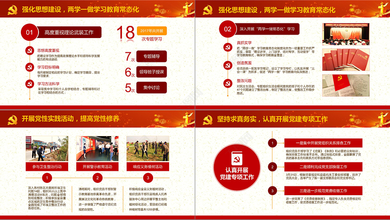 專題輔導(dǎo)強(qiáng)化思想建設(shè),兩學(xué)一做學(xué)習(xí)教育常態(tài)化采取集中學(xué)習(xí)和個(gè)人自學(xué)相結(jié)合,專題輔導(dǎo)和討論學(xué)習(xí)相結(jié)合的方式;每月都制定相應(yīng)的學(xué)習(xí)計(jì)劃,確定學(xué)習(xí)篇目,提出學(xué)習(xí)要求;把理論學(xué)習(xí)作為提高政策理論水平和領(lǐng)導(dǎo)科學(xué)發(fā)展能力的有效途徑;18次專題學(xué)習(xí)01高度重視理論武裝工作思想高度重視學(xué)習(xí)目標(biāo)明確學(xué)習(xí)方法科學(xué)2017年共開(kāi)展領(lǐng)導(dǎo)班子授課集中討論