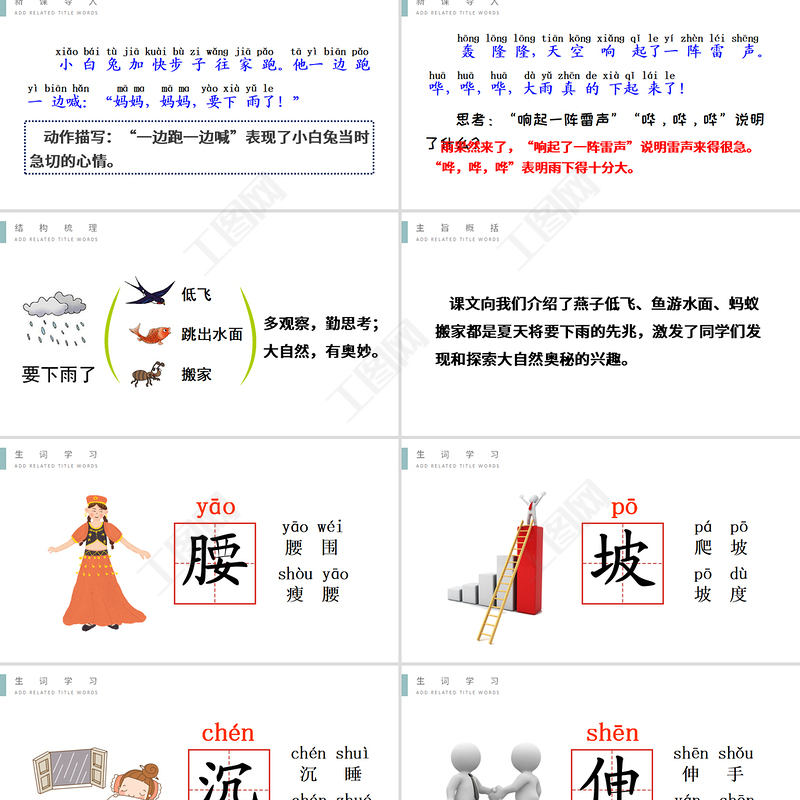 新課導入ADD RELATED TITLE WORDS動作描寫:“連忙”“挎起籃子”“跑”這些動作描寫,生動形象地描繪出小白兔此時已經完全相信要下雨了,害怕被雨淋的焦急的樣子。