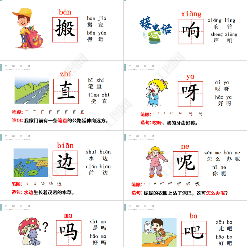 生詞學習ADD RELATED TITLE WORDSnezěn me bàn ne 怎 么 辦 呢nǐ ne你 呢造句:妮妮的衣服上沾了泥巴,這可怎么辦呢?筆順: