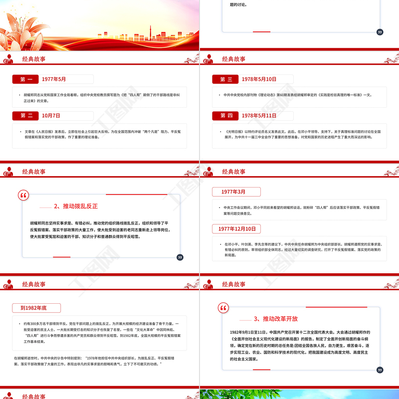 感謝您下載包圖網(wǎng)平臺上提供的PPT作品,為了您和包圖網(wǎng)以及原創(chuàng)作者的利益,請勿復制、傳播、銷售,否則將承擔法律責任!包圖網(wǎng)將對作品進行維權,按照傳播下載次數(shù)進行十倍的索取賠償! 888ppt.com 授課人:某某某 時間:2023.12.22 2025年11月20日是胡耀邦同志誕辰110周年紀念日 紀念胡耀邦同志誕辰 110周年 感謝您下載包圖網(wǎng)平臺上提供的PPT作品,為了您和包圖網(wǎng)以及原創(chuàng)作者的利益,請勿復制、傳播、銷售,否則將承擔法律責任!包圖網(wǎng)將對作品進行維權,按照傳播下載次數(shù)進行十倍的索取賠償! 888ppt.com 第一部分 感謝您下載包圖網(wǎng)平臺上提供的PPT作品,為了您和包圖網(wǎng)以及原創(chuàng)作者的利益,請勿復制、傳播、銷售,否則將承擔法律責任!包圖網(wǎng)將對作品進行維權,按照傳播下載次數(shù)進行十倍的索取賠償! 888ppt.com 胡耀邦,男,字國光,湖南瀏陽人 久經(jīng)考驗的忠誠的共產(chǎn)主義戰(zhàn)士,偉大的無產(chǎn)階級革命家、政治家, 我軍杰出的政治工作者,長期擔任黨的重要領導職務的卓越領導人。 曾在1981年6月至1987年1月?lián)沃泄仓醒胫飨⒅袊伯a(chǎn)黨中央委員 會總書記職務。 生平履歷 感謝您下載包圖網(wǎng)平臺上提供的PPT作品,為了您和包圖網(wǎng)以及原創(chuàng)作者的利益,請勿復制、傳播、銷售,否則將承擔法律責任!包圖網(wǎng)將對作品進行維權,按照傳播下載次數(shù)進行十倍的索取賠償! 888ppt.com 第二部分 感謝您下載包圖網(wǎng)平臺上提供的PPT作品,為了您和包圖網(wǎng)以及原創(chuàng)作者的利益,請勿復制、傳播、銷售,否則將承擔法律責任!包圖網(wǎng)將對作品進行維權,按照傳播下載次數(shù)進行十倍的索取賠償! 888ppt.com 經(jīng)典故事 1、組織和推動關于真理標準問題的討論 胡耀邦同志堅持黨的解放思想、實事求是的思想路線,組織和推動了關于真理標準問 題的討論。 感謝您下載包圖網(wǎng)平臺上提供的PPT作品,為了您和包圖網(wǎng)以及原創(chuàng)作者的利益,請勿復制、傳播、銷售,否則將承擔法律責任!包圖網(wǎng)將對作品進行維權,按照傳播下載次數(shù)進行十倍的索取賠償! 888ppt.com 經(jīng)典故事 第 一 1977年5月 ? 胡耀邦同志從黨和國家工作全局著眼,組織中央黨校教員撰寫題為《把“四人幫”顛倒了的干部路線是非糾 正過來》的文章。 第 二 ? 文章在《人民日報》發(fā)表后,立即在社會上引起巨大反響,為在全國范圍內沖破“兩個凡是”阻力、平反冤 假錯案和落實黨的干部政策,作了重要的理論準備。 10月7日 感謝您下載包圖網(wǎng)平臺上提供的PPT作品,為了您和包圖網(wǎng)以及原創(chuàng)作者的利益,請勿復制、傳播、銷售,否則將承擔法律責任!包圖網(wǎng)將對作品進行維權,按照傳播下載次數(shù)進行十倍的索取賠償! 888ppt.com 經(jīng)典故事 第 三 1978年5月10日 ? 中共中央黨校內部刊物《理論動態(tài)》第60期發(fā)表經(jīng)胡耀邦審定的《實踐是檢驗真理的唯一標準》一文。 第 四 ? 《光明日報》以特約評論員名義發(fā)表此文。此后,在鄧小平領導、支持下,關于真理標準問題的討論在全國 展開,為中共十一屆三中全會作了重要的思想準備,對黨和國家的歷史進程產(chǎn)生了重大而深遠的影響。 1978年5月11日 感謝您下載包圖網(wǎng)平臺上提供的PPT作品,為了您和包圖網(wǎng)以及原創(chuàng)作者的利益,請勿復制、傳播、銷售,否則將承擔法律責任!包圖網(wǎng)將對作品進行維權,按照傳播下載次數(shù)進行十倍的索取賠償! 888ppt.com 經(jīng)典故事 2、推動撥亂反正 胡耀邦同志堅持實事求是、有錯必糾,推動黨的組織路線撥亂反正,組織和領導了平 反冤假錯案、落實干部政策的大量工作,使大批受到迫害的老同志重新走上領導崗位, 使大批蒙受冤屈和迫害的干部、知識分子和普通群眾得到平反昭雪。 感謝您下載包圖網(wǎng)平臺上提供的PPT作品,為了您和包圖網(wǎng)以及原創(chuàng)作者的利益,請勿復制、傳播、銷售,否則將承擔法律責任!包圖網(wǎng)將對作品進行維權,按照傳播下載次數(shù)進行十倍的索取賠償! 888ppt.com 經(jīng)典故事 1977年3月 ? 中央工作會議期間,鄧小平同前來看望的胡耀邦談話,就粉碎“四人幫”后應該落實干部政策、平反冤假錯 案等問題交換意見。 ? 在鄧小平、葉劍英、李先念等的建議下,中共中央任命胡耀邦為中央組織部部長。胡耀邦遵照黨的實事求是、 有錯必糾的原則,率領組織部全體同志,經(jīng)過大量切實的調查研究,打開了平反冤假錯案、落實黨的政策的 新局面。 1977年12月10日 感謝您下載包圖網(wǎng)平臺上提供的PPT作品,為了您和包圖網(wǎng)以及原創(chuàng)作者的利益,請勿復制、傳播、銷售,否則將承擔法律責任!包圖網(wǎng)將對作品進行維權,按照傳播下載次數(shù)進行十倍的索取賠償! 888ppt.com 經(jīng)典故事 到1982年底 ? 約有300多萬名干部得到平反。黨在干部問題上的撥亂反正,為開展大規(guī)模的經(jīng)濟建設準備了骨干力量。一 批受迫害的民主人士、一大批長期受打擊的知識分子也恢復了名譽。一些在“文化大革命”中因同林彪、 “四人幫”進行斗爭而慘遭殺害的共產(chǎn)黨員和群眾得到平反昭雪。到1982年底,全國大規(guī)模的平反冤假錯案 工作基本結束。 在胡耀邦