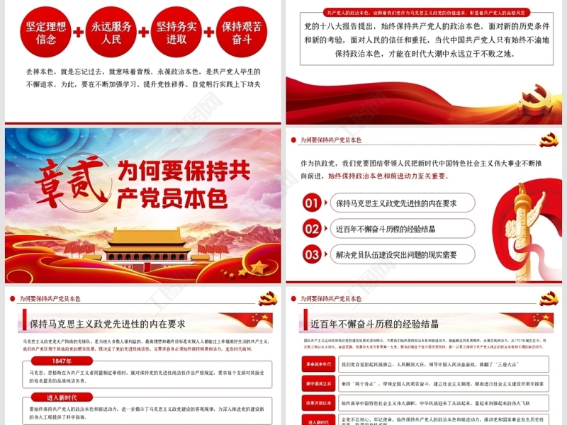 為何要保持共產黨員本色保持馬克思主義政黨先進性的內在要求馬克思主義政黨是無產階級的先鋒隊,是為絕大多數(shù)人謀利益的,最高理想和最終目標是實現(xiàn)人人都能過上幸福美好生活的共產主義。我們共產黨區(qū)別于其他政黨的根本性質,既決定了黨的先進性純潔性,又要求自身必須始終保持特質和活力,走在時代前列。1847年馬克思、恩格斯在為共產主義者同盟制定章程時,就對保持黨的先進性純潔性作出嚴格規(guī)定,要求每個支部對其接受的每名盟員的品質純潔負責。進入新時代要始終保持共產黨人的政治本色和前進動力,進一步揭示了馬克思主義政黨建設的客觀規(guī)律,為深入推進黨的建設新的偉大工程提供了科學指南。