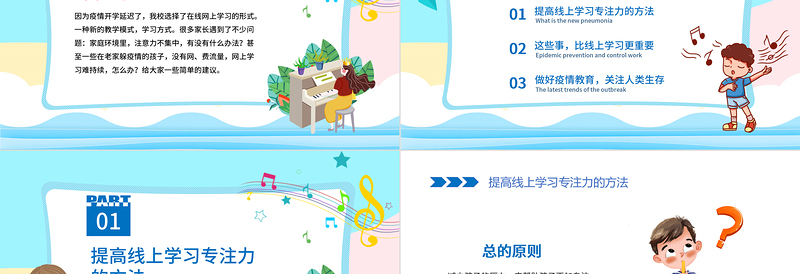 目錄CONTENTS010203提高線上學(xué)習(xí)專注力的方法What is the new pneumonia這些事,比線上學(xué)習(xí)更重要Epidemic prevention and control work做好疫情教育,關(guān)注人類生存The latest trends of the outbreak