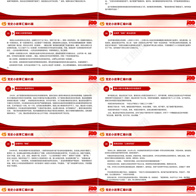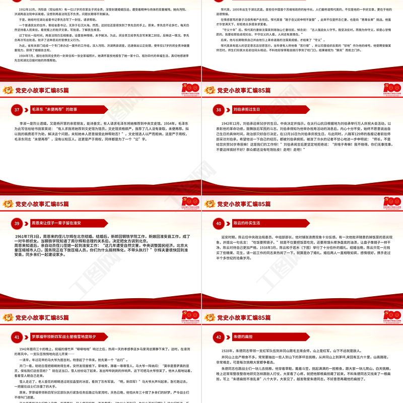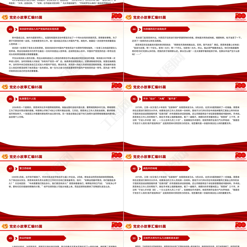 工圖網(wǎng)提供1921-2021黨史小故事匯編85篇PPT中小學(xué)生學(xué)黨史紅色教育專題黨課PPT模板供會(huì)員免費(fèi)下載。更多精彩黨課PPT素材,盡在工圖網(wǎng)。