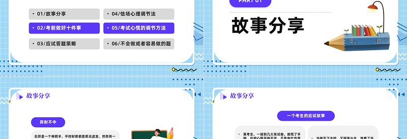 CONTENT01/故事分享02/考前做好十件事03/應試答題策略04/怯場心理調節法05/考試心慌的調節方法06/不會做或者容易做的題