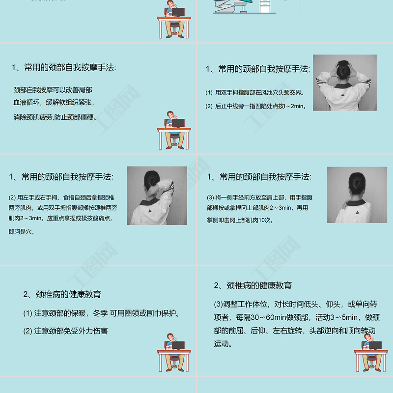 1、常用的頸部自我按摩手法: 頸部自我按摩可以改善局部 血液循環(huán),緩解軟組織緊張, 消除頸肌疲勞,防止頸部僵硬。