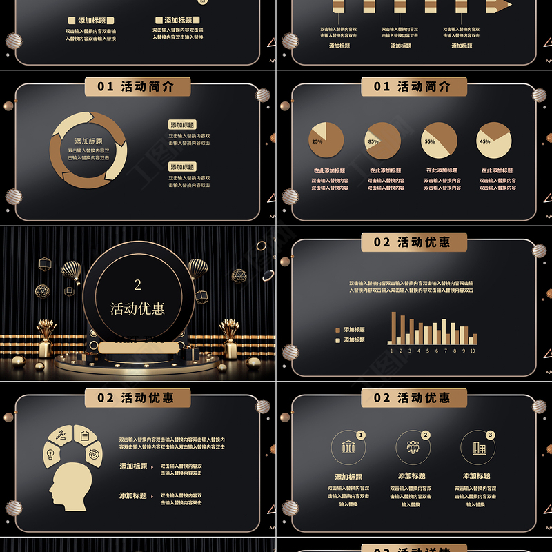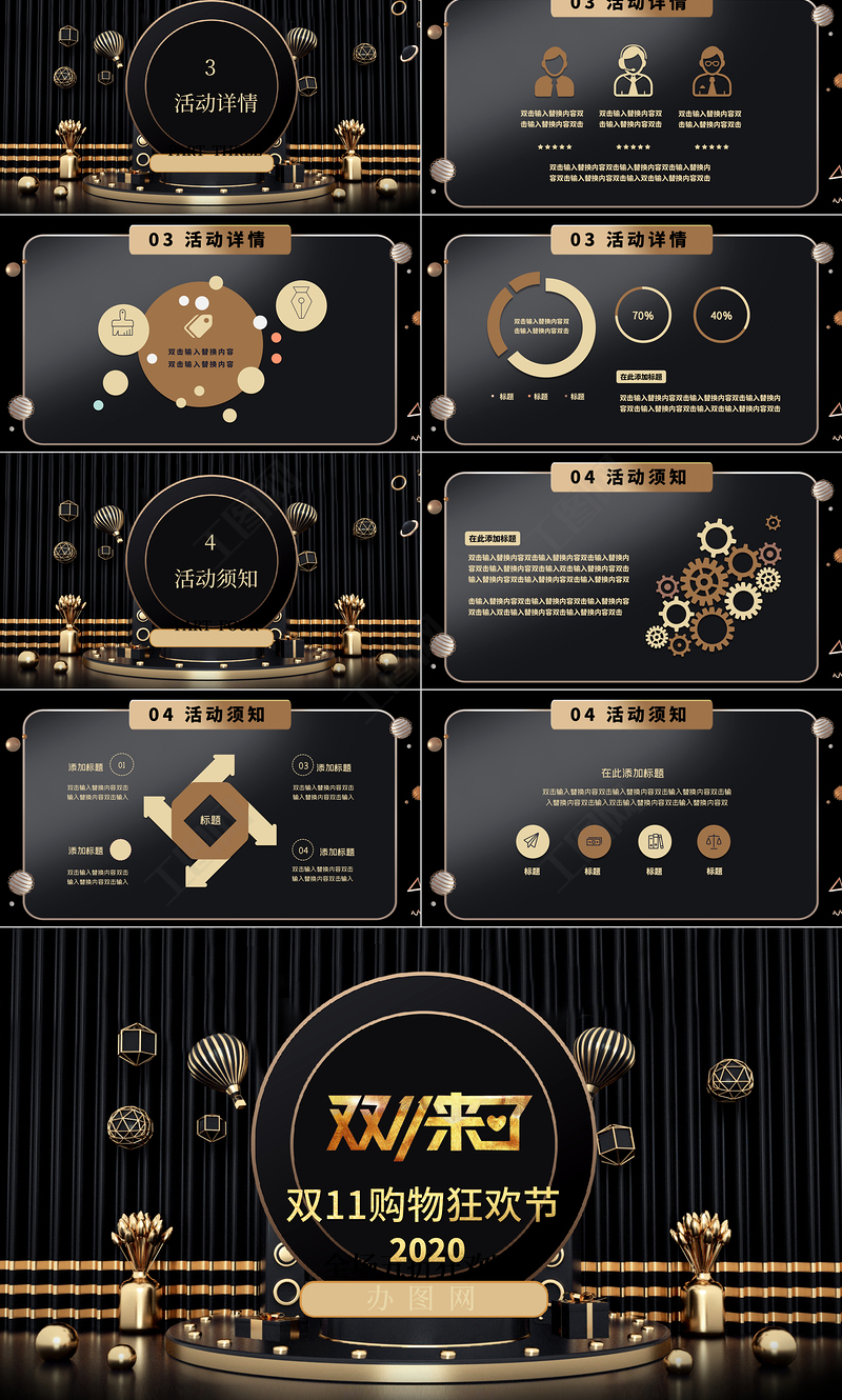 工圖網(wǎng)提供黑金奢華雙11電商促銷活動方案PPT模板供會員免費下載。更多精彩黨課PPT素材,盡在工圖網(wǎng)。