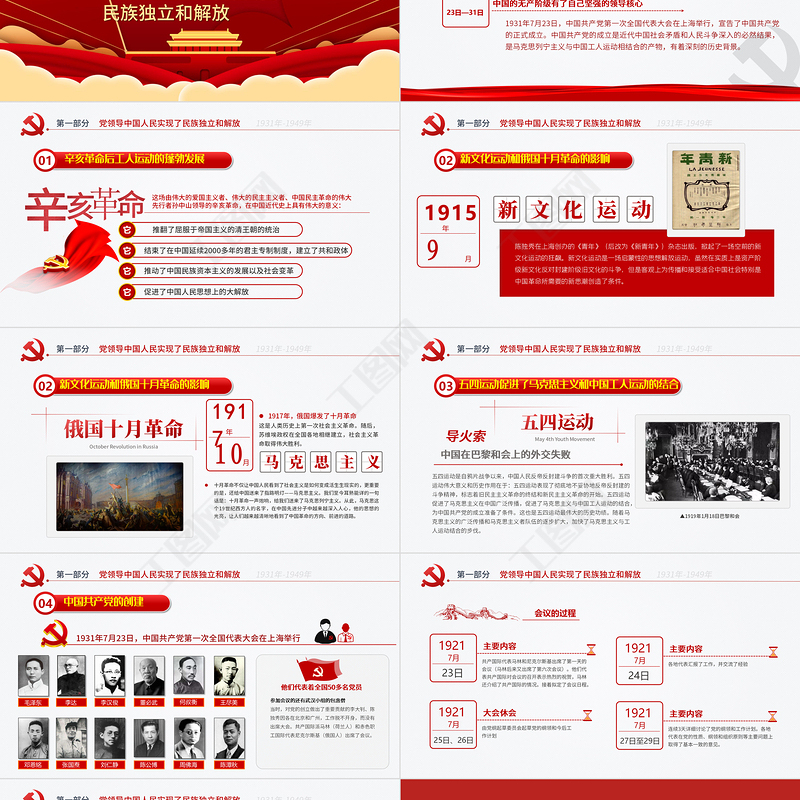 第一部分 黨領(lǐng)導(dǎo)中國人民實現(xiàn)了民族獨立和解放1931年-1949年1931年7月23日,中國共產(chǎn)黨第一次全國代表大會在上海舉行參加會議的還有武漢小組的包惠僧當(dāng)時,對黨的創(chuàng)立做出了重要貢獻的李大釗、陳獨秀因各在北京和廣州,工作脫不開身,而沒有出席大會。共產(chǎn)國際派馬林(荷蘭人)和赤色職工國際代表尼克爾斯基(俄國人)出席了會議。他們代表著全國50多名黨員