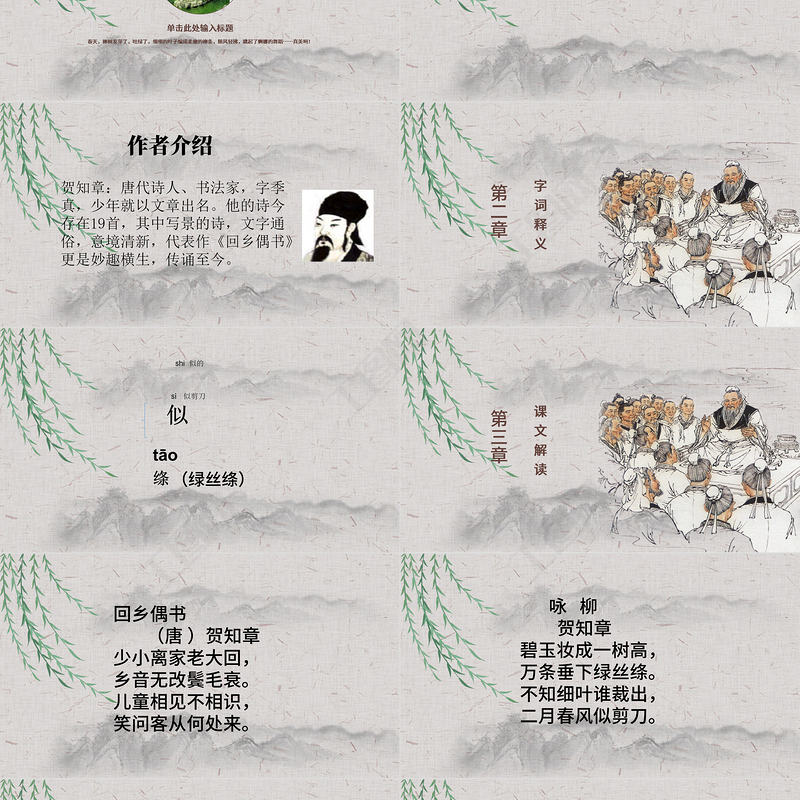 作者介紹賀知章:唐代詩人、書法家,字季真,少年就以文章出名。他的詩今存在19首,其中寫景的詩,文字通俗,意境清新,代表作《回鄉偶書》更是妙趣橫生,傳誦至今。