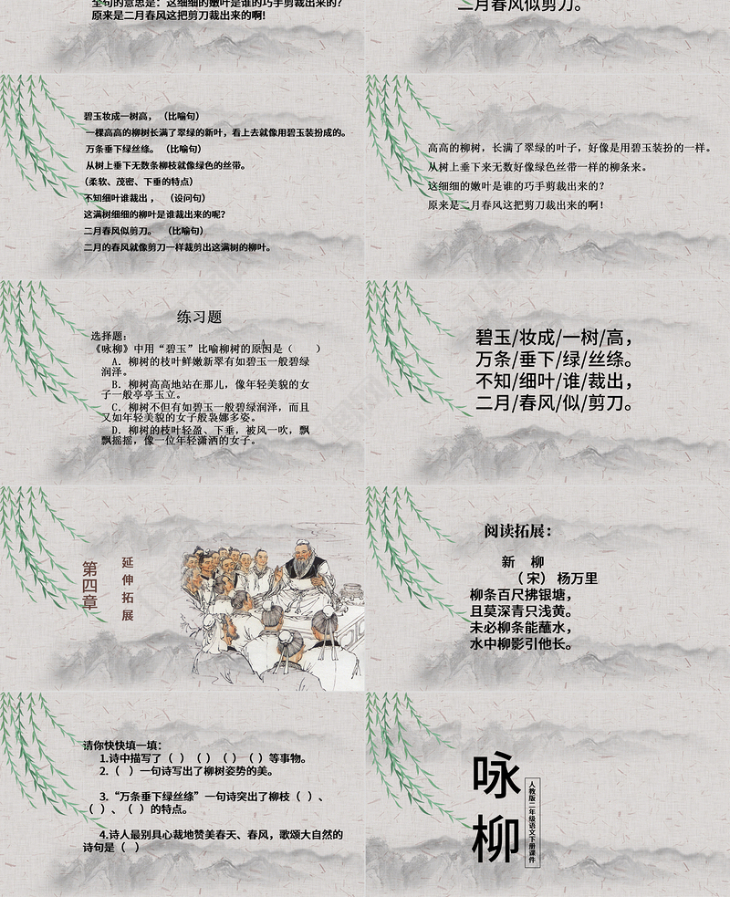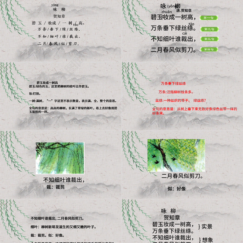 碧玉妝成一樹高, (比喻句) 一棵高高的柳樹長滿了翠綠的新葉,看上去就像用碧玉裝扮成的。 萬條垂下綠絲絳。 (比喻句) 從樹上垂下無數條柳枝就像綠色的絲帶。 (柔軟、茂密、下垂的特點) 不知細葉誰裁出 , (設問句) 這滿樹細細的柳葉是誰裁出來的呢? 二月春風似剪刀。 (比喻句) 二月的春風就像剪刀一樣裁剪出這滿樹的柳葉。