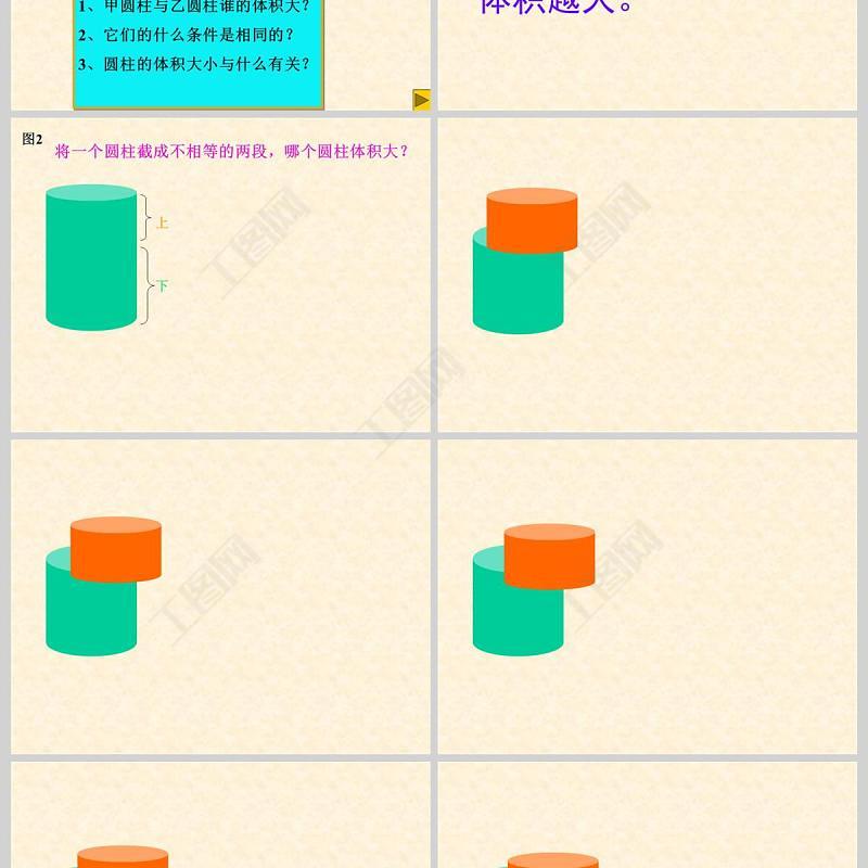 工圖網提供 九年義務教育六年制小學數學課件第十二冊圓柱的體積PPT模板供會員免費下載。更多精彩黨課PPT素材,盡在工圖網。