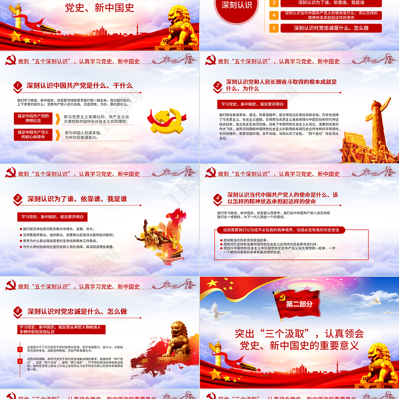 做到“五個深刻認識”,認真學習黨史、新中國史五個深刻認識1深刻認識中國共產黨是什么、干什么2深刻認識黨和人民長期奮斗取得的根本成就是什么、為什么3深刻認識為了誰、依靠誰、我是誰4深刻認識當代中國共產黨人的使命是什么、該以怎樣的精神狀態承擔起這樣的使命5深刻認識對黨忠誠是什么、怎么做