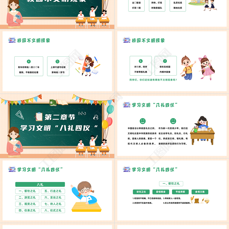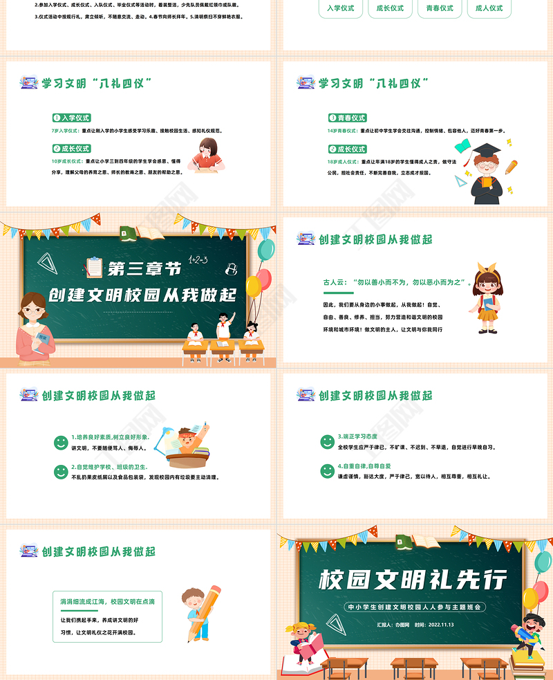 2022校園文明禮先行PPT清新卡通風中小學生創建文明校園人人參與校園禮儀文明主題班會課件模板 Array