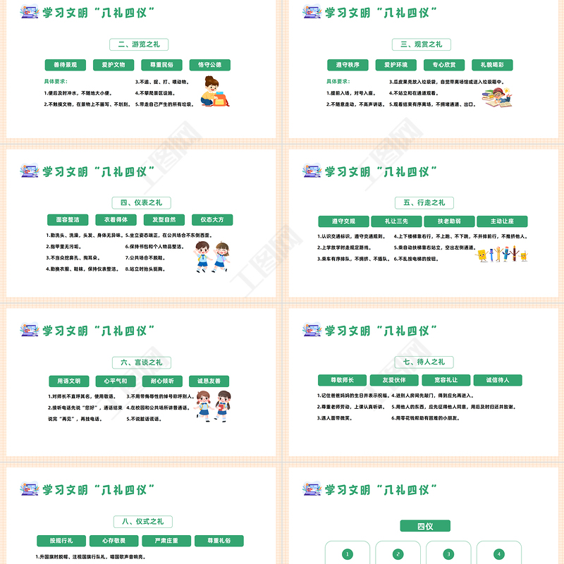 八禮一、餐飲之禮二、游覽之禮三、觀賞之禮四、儀表之禮五、行走之禮六、言談之禮七、待人之禮八、儀式之禮