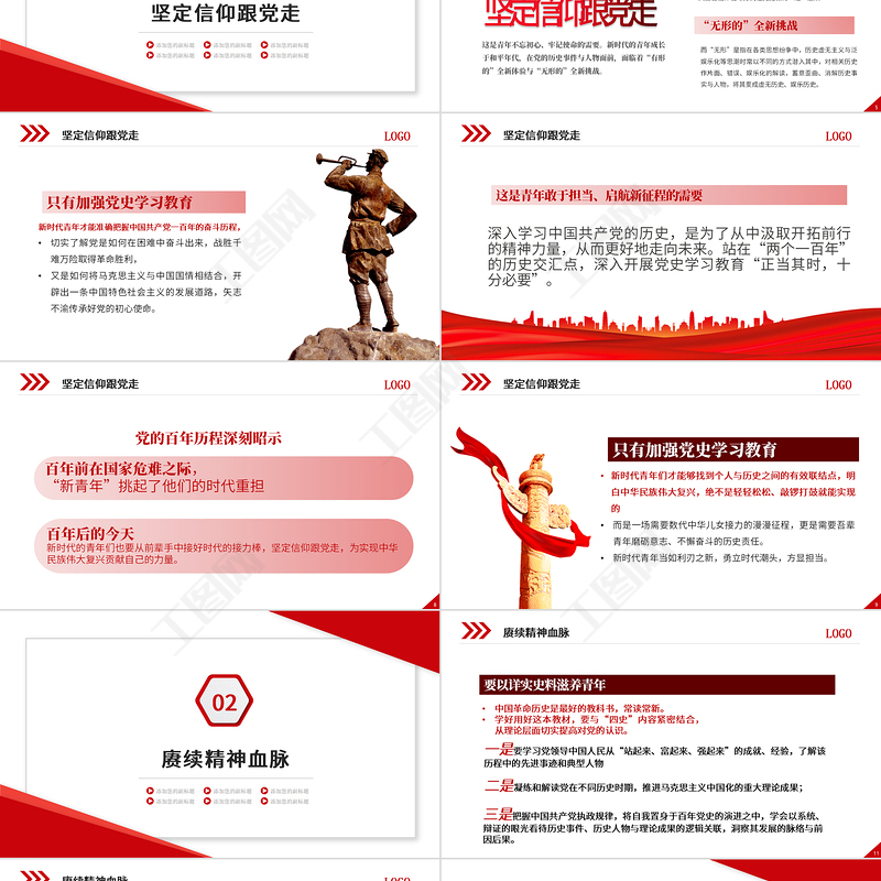 <p>2021 year-end summary work summarizes the boutique PPTAbout the summary text input or copy here中國共青團團課PPT部門:宣傳部匯報人:某某某青年一代有理想、有擔當,國家就有前途,民族就有希望</p><br><p>前言/PREFAACE青年一代有理想、有擔當,國家就有前途,民族就有希望,實現中華民族偉大復興就有源源不斷的強大力量。青年一代的精神狀態、理想信念與綜合素質如何,關乎黨和國家能否實現薪火相傳、后繼有人。中國共產黨自成立以來,就高度重視青年在黨和國家事業發展中的特殊地位與重要作用,對青年成長成才寄予信任與厚望。</p><br><p>目錄CONTENTS</p><br><p>堅定信仰跟黨走01</p><br><p>“有形的”全新體驗“有形”在于黨史學習教育的途徑與形式日趨多樣化。隨著互聯網的發展,社交平臺、短視頻賬號、教育網頁等皆是黨史知識輸出的平臺,通過圖文、動畫、視頻、人工智能體驗等方式讓黨史教育“活”起來這是青年不忘初心、牢記使命的需要。新時代的青年成長于和平年代,在黨的歷史事件與人物面前,面臨著“有形的”全新體驗與“無形的”全新挑戰。“無形的”全新挑戰而“無形”是指在各類思想紛爭中,歷史虛無主義與泛娛樂化等思潮時常以不同的方式潛入其中,對相關歷史作片面、錯誤、娛樂化的解讀,蓄意歪曲、消解歷史事實與人物,將其變成虛無歷史、娛樂歷史。堅定信仰 跟黨走堅定信仰跟黨走</p><br><p>只有加強黨史學習教育新時代青年才能準確把握中國共產黨一百年的奮斗歷程,切實了解黨是如何在困難中奮斗出來,戰勝千難萬險取得革命勝利,又是如何將馬克思主義與中國國情相結合,開辟出一條中國特色社會主義的發展道路,矢志不渝傳承好黨的初心使命。堅定信仰跟黨走</p><br><p>這是青年敢于擔當、啟航新征程的需要深入學習中國共產黨的歷史,是為了從中汲取開拓前行的精神力量,從而更好地走向未來。站在“兩個一百年”的歷史交匯點,深入開展黨史學習教育“正當其時,十分必要”。堅定信仰跟黨走</p><br><p>黨的百年歷程深刻昭示百年前在國家危難之際,“新青年”挑起了他們的時代重擔百年后的今天新時代的青年們也要從前輩手中接好時代的接力棒,堅定信仰跟黨走,為實現中華民族偉大復興貢獻自己的力量。堅定信仰跟黨走</p><br><p>只有加強黨史學習教育新時代青年們才能夠找到個人與歷史之間的有效聯結點,明白中華民族偉大復興,絕不是輕輕松松、敲鑼打鼓就能實現的而是一場需要數代中華兒女接力的漫漫征程,更是需要吾輩青年磨礪意志、不懈奮斗的歷史責任。新時代青年當如利刃之新,勇立時代潮頭,方顯擔當。堅定信仰跟黨走</p><br><p>賡續精神血脈02</p><br><p>要以詳實史料滋養青年中國革命歷史是最好的教科書,常讀常新。學好用好這本教材,要與“四史”內容緊密結合,從理論層面切實提高對黨的認識。一是要學習黨領導中國人民從“站起來、富起來、強起來”的成就、經驗,了解該歷程中的先進事跡和典型人物二是凝練和解讀黨在不同歷史時期,推進馬克思主義中國化的重大理論成果;三是把握中國共產黨執政規律,將自我置身于百年黨史的演進之中,學會以系統、辯證的眼光看待歷史事件、歷史人物與理論成果的邏輯關聯,洞察其發展的脈絡與前因后果。賡續精神血脈</p><br><p>要以精神力量引領青年無精神則不立,國無精神則不強。紅色基因、革命薪火之所以能夠代代傳承,就在于黨在百年歷程中構筑起了具有豐富歷史內涵和思想意義的精神譜系,并得到廣泛的認可和傳承。在特定歷史時期,基于革命歷史和實踐的發展,共產黨人的精神譜系逐漸形成。它們集中體現了黨的堅定信念、根本宗旨、優良作風,凝聚著中國共產黨人艱苦奮斗、犧牲奉獻、開拓進取的偉大品格。在黨史學習教育中要將精神譜系的深刻內涵全方位、多角度呈現出來,使之成為激勵后人獨立前行的強大力量。賡續精神血脈</p><br><p>凝聚青年力量03</p><br><p>堅持網上與網下相結合互聯網空間作為青年聚集的重要場域,對于其價值觀念的形成具有重要的影響。1要推動黨史學習教育在青年群體中全面開展、多點突破,就必須以互聯網平臺為依托,打破時空的限制,在學習內容的有效供給上下功夫,給青年予更大的靈活性和自主權,提供更為高效、高質量的自主教育:2創建黨史學習教育專題網站與欄目,充分運用微黨課、微視頻、圖文、音頻等傳播技術和手段,讓黨史教育插上“云翅膀”;3加強網絡實時互動與交流,設置“知識自測”等反饋環節,利用大數據動態呈現團隊及個人的學習狀態。凝聚青年力量</p><br><p>要夯實傳統教育陣地,推動黨史教育與學校課堂、紅色基地等相融合,打造黨史教育“雙課堂”,達到1+1>2的效果一是“固定課堂”常規學確保黨史學習到位。按照黨史學習教育計劃,開展黨史教育“思政第一課”,制定常規學習內容;進行集體備課,讓黨史學習教育進教材、進課堂,融入學校育人課程中。二是“移動課堂”創新學推動教育效果走實。將當地的紅色革命遺址、博物館、基層社區等納入學習探究和考察實踐的現場教學點,依托其紅色教育資源制定紅色線路、組織開展黨史教育主題活動,讓學生在“移動”的課堂情景和氛圍中感知、理解、傳承紅色文化。凝聚青年力量</p><br><p>堅持知與行相統一推動黨史學習教育向縱深開展,使青年在知行合一