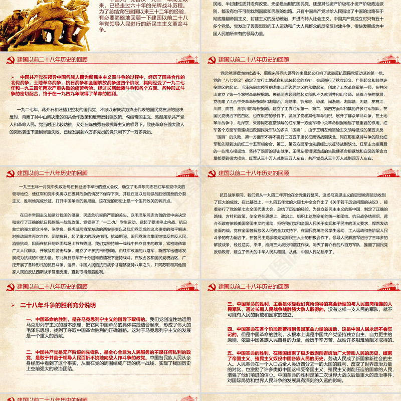 建國以前二十八年歷史的回顧延時符二十八年斗爭的勝利充分說明一、中國革命的勝利,是在馬克思列寧主義的指導下取得的。我們黨創造性地運用馬克思列寧主義的基本原理,把它同中國革命的具體實踐結合起來,形成了偉大的毛澤東思想,找到了奪取中國革命勝利的正確道路。這對于馬克思列寧主義的發展是一個重大的貢獻。二、中國共產黨是無產階級的先鋒隊,是全心全意為人民服務的不謀任何私利的政黨,是敢于并善于領導人民百折不撓地向敵人作斗爭的政黨。中國各民族人民從親身經歷中看到了這個事實,從而在黨的周圍結成廣泛的統一戰線,實現了我國歷史上空前強大的政治團結。