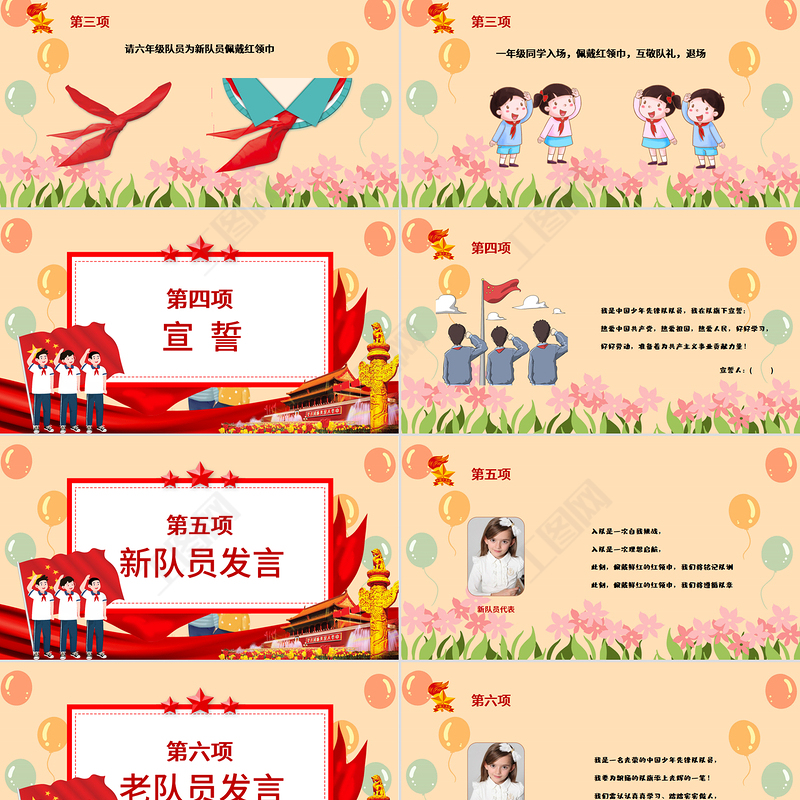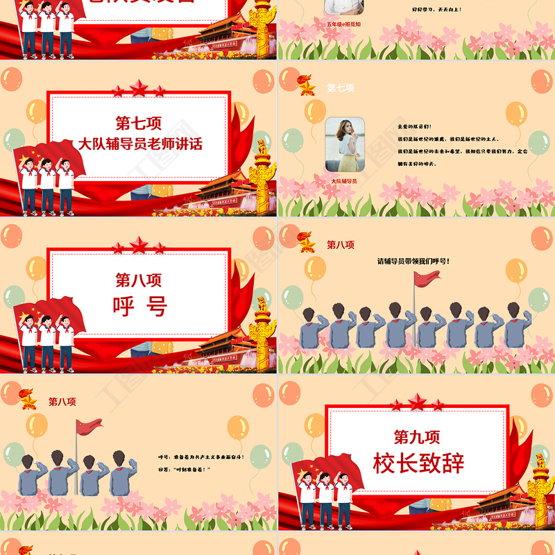 大會流程01 出旗02 入隊決定03 戴紅領巾04 宣誓05 新隊員發言06 老隊員發言07 大隊輔導員老師講話08 呼號09 校長致辭10 退場