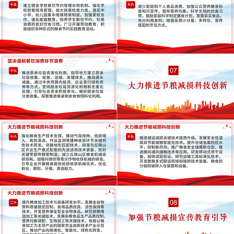 開展節糧減損文明創建。把節糧減損要求融入市民公約、村規民約、行業規范等,推進糧食節約宣傳教育進機關、進學校、進企業、進社區、進農村、進家庭、進軍營。將文明餐桌、“光盤行動”等要求納入文明城市、文明村鎮、文明單位、文明家庭、文明校園創建內容,切實發揮各類創建的導向和示范作用。二十一
