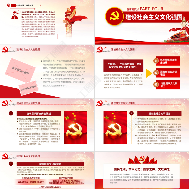 建設(shè)社會(huì)主義文化強(qiáng)國1949年9月底,在新中國即將誕生之際,毛zd同志充滿自信地預(yù)見:“隨著經(jīng)濟(jì)建設(shè)的高潮的到來,不可避免地將要出現(xiàn)一個(gè)文化建設(shè)的高潮。中國人被人認(rèn)為不文明的時(shí)代已經(jīng)過去了,我們將以一個(gè)具有高度文化的民族出現(xiàn)于世界。”70年過去了,這個(gè)預(yù)見正在逐漸變?yōu)楝F(xiàn)實(shí),我們迎來了社會(huì)主義文化的繁榮發(fā)展,正在為建設(shè)社會(huì)主義文化強(qiáng)國而不懈奮斗。