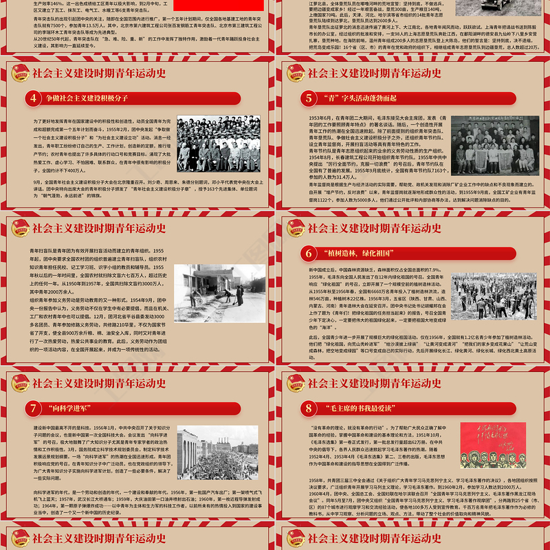 概括地講走進社會主義建設時期,在百廢待興的新中國建設征程中,感受中國青年把青春獻給祖國的無悔奮斗!一個時代最為鮮明的特點,莫過于改天換地,新舊交替。1949年10月1日被歷史定格,一個舊時代結束了,新的時代開始了。中華人民共和國的成立,開啟了中華民族偉大復興的歷史新紀元。廣大青年在中國共產黨的路線方針政策指引下,同全國人民一道,踏上了實施社會主義改造、建立社會主義制度、探索社會主義道路的新征程。這一時期的中國青年運動體現出鮮明的建設性特征。