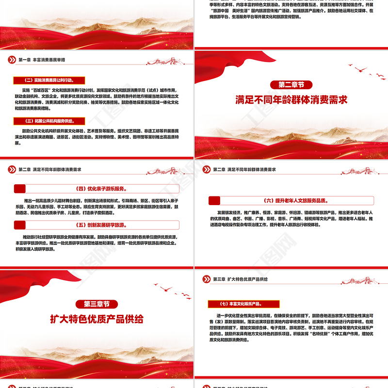 第二章??滿足不同年齡群體消費需求發(fā)展銀發(fā)經濟,推廣康養(yǎng)、慢游、家庭游、懷舊游、錯峰游等旅游產品,推出更多適合老年人的優(yōu)質戲曲、曲藝、書畫、廣播、影視、音樂、廣場舞、短視頻等文化產品,增進老年人福祉。推進酒店電視操作復雜專項治理工作,提升老年人旅游出行收視體驗。