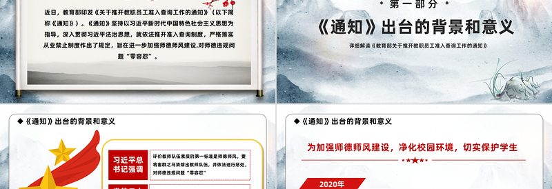 工圖網提供2023加強師德師風建設推開準入查詢工作PPT水墨畫風詳細解讀《教育部關于推開教職員工準入查詢工作的通知》專題課件模板供會員免費下載。更多精彩黨課PPT素材,盡在工圖網。