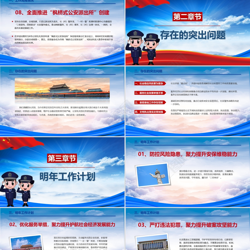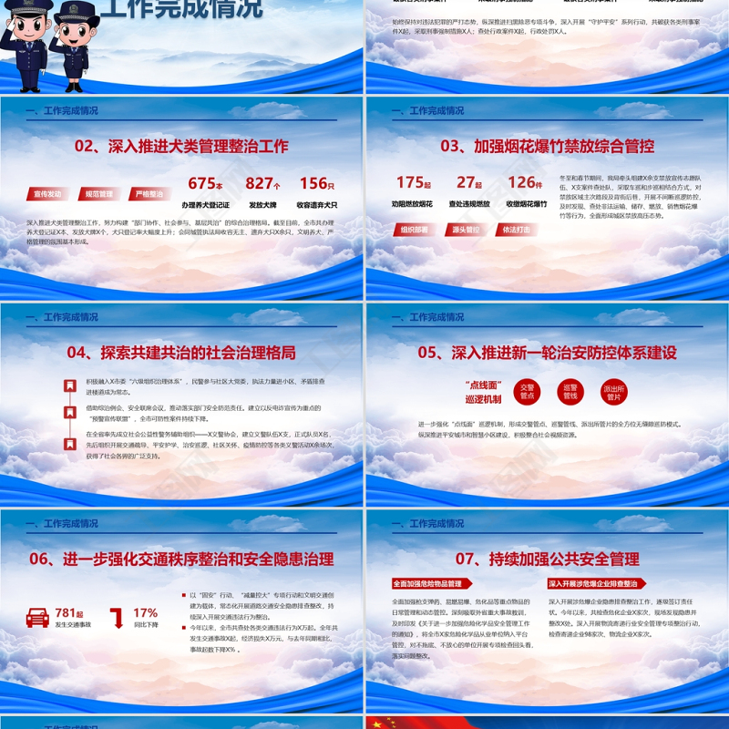<p>立 黨 為 公 ★ 執(zhí) 政 為 民匯報人:XXX 時間:2021</p><br><p>本年度工作總結(jié)存在的突出問題明年工作計劃目 錄CONTENTS010203</p><br><p>前 言 20XX年,在市委、市政府和上級公安機關(guān)的正確領(lǐng)導(dǎo)下,深入學習黨的十九大和重要講話、重要訓詞精神,全面貫徹全國、全省和X市公安工作會議精神,以深化掃黑除惡專項斗爭為龍頭,持續(xù)開展“守護平安”系列行動,嚴厲打擊各類違法犯罪活動,為X經(jīng)濟社會發(fā)展創(chuàng)造了更加和諧穩(wěn)定的社會環(huán)境。</p><br><p>工作完成情況第一章節(jié)</p><br><p>一、工作完成情況01、保持對違法犯罪的嚴打態(tài)勢82起破獲各類刑事案件153人采取刑事強制措施56起破獲各類刑事案件73人采取刑事強制措施始終保持對違法犯罪的嚴打態(tài)勢,縱深推進掃黑除惡專項斗爭,深入開展“守護平安”系列行動,共破獲各類刑事案件X起,采取刑事強制措施X人;查處行政案件X起,行政處罰X人。</p><br><p>一、工作完成情況02、深入推進犬類管理整治工作675本辦理養(yǎng)犬登記證827個發(fā)放犬牌156只收容遺棄犬只深入推進犬類管理整治工作,努力構(gòu)建“部門協(xié)作、社會參與、基層共治”的綜合治理格局。截至目前,全市共辦理養(yǎng)犬登記證X本、發(fā)放犬牌X個,犬只登記率大幅度上升;會同城管執(zhí)法局收容無主、遺棄犬只X余只,文明養(yǎng)犬、嚴格管理的氛圍基本形成。</p><br><p>一、工作完成情況03、加強煙花爆竹禁放綜合管控175起勸阻燃放煙花27起查處違規(guī)燃放冬至和春節(jié)期間,我局牽頭組建X余支禁放宣傳志愿隊伍、X支案件查處隊,采取車巡和步巡相結(jié)合方式,對禁放區(qū)域主次路段及背街后巷,開展不間斷巡邏防控,及時發(fā)現(xiàn)、查處非法運輸、儲存、燃放、銷售煙花爆竹等行為,全面形成城區(qū)禁放高壓態(tài)勢。126件收繳煙花爆竹</p><br><p>一、工作完成情況積極融入X市委“六級組織治理體系”,民警參與社區(qū)大黨委,執(zhí)法力量進小區(qū)、矛盾排查進樓道成為常態(tài)。借助綜治例會、安全聯(lián)席會議,推動落實部門安全防范責任。建立以反電詐宣傳為重點的“預(yù)警宣傳聯(lián)盟”,全市可防性案件持續(xù)下降。在全省率先成立社會公益性警務(wù)輔助組織——X義警協(xié)會,建立義警隊伍X支,正式隊員X名,先后組織開展交通疏導(dǎo)、平安護學、治安巡邏、社區(qū)關(guān)懷、疫情防控等各類義警活動X余場次,獲得了社會各界的廣泛支持。04、探索共建共治的社會治理格局</p><br><p>一、工作完成情況05、深入推進新一輪治安防控體系建設(shè)“點線面”巡邏機制進一步強化“點線面”巡邏機制,形成交警管點、巡警管線、派出所管片的全方位無縫隙巡防模式??v深推進平安城市和智慧小區(qū)建設(shè),積極整合社會視頻資源。</p><br><p>一、工作完成情況06、進一步強化交通秩序整治和安全隱患治理781起發(fā)生交通事故以“固安”行動、“減量控大”專項行動和文明交通創(chuàng)建為載體,常態(tài)化開展道路交通安全隱患排查整改,持續(xù)深入開展交通違法行為整治。今年以來,全市共查處各類交通違法行為X萬起。全年共發(fā)生交通事故X起,經(jīng)濟損失X萬元,與去年同期相比,事故起數(shù)下降X% 。17%同比下降</p><br><p>一、工作完成情況07、持續(xù)加強公共安全管理全面加強槍支彈藥、易燃易爆、?;返戎攸c物品的日常管理和動態(tài)管控。深刻吸取外省重大事故教訓,及時印發(fā)《關(guān)于進一步加強危險化學品安全管理工作的通知》,將全市X家危險化學品從業(yè)單位納入平臺管控,對不拖底、不放心的單位開展專項檢查回頭看,落實問題整改。深入開展涉危爆企業(yè)隱患排查整治工作,逐級簽訂責任狀。今年以來,共檢查危化企業(yè)X家次,現(xiàn)場發(fā)現(xiàn)隱患并整改X處。深入開展物流寄遞行業(yè)安全管理專項整治行動,檢查寄遞企業(yè)98家次、物流企業(yè)X家次。</p><br><p>一、工作完成情況08、全面推進“楓橋式公安派出所”創(chuàng)建堅持全員創(chuàng)建、全域創(chuàng)建,打造以派出所為龍頭,社(村)警務(wù)室、“一村一警”和鎮(zhèn)村聯(lián)調(diào)中心為基礎(chǔ)的“三級架構(gòu)、四級聯(lián)動”社區(qū)警務(wù)模式,推動網(wǎng)格警務(wù)、社(村)事務(wù)、社(村)治理一體化、一網(wǎng)兜,全面夯實基層基礎(chǔ)工作。在學訓詞勇?lián)擷市公安機關(guān)2020年度“楓橋式公安派出所”爭創(chuàng)現(xiàn)場演示匯報會議上,我局X經(jīng)實地測評和現(xiàn)場演示,分獲總成績第一、第五,雙雙被命名為市級“楓橋式公安派出所”,X派出所進入推薦申報省廳命名的候選派出所名單。</p><br><p>存在的突出問題第二章節(jié)</p><br><p>二、存在的突出問題 我們清醒的認識到,當今世界正經(jīng)歷百年未有之大變局,新冠肺炎疫情全球大流行使這個大變局加速演進,世界進入動蕩變革期,維護社會穩(wěn)定的形勢空前嚴峻,公安機關(guān)的任務(wù)更加艱巨。與新時代公安機關(guān)新的職責使命相比,與市委、市政府的要求相比,我們還有一定的差距。</p><br><p>二、存在的突出問題社會矛盾“燃點低”,矛盾糾紛排查調(diào)解的社會化管控工作依然需要加強。服務(wù)經(jīng)濟社會發(fā)展和保障