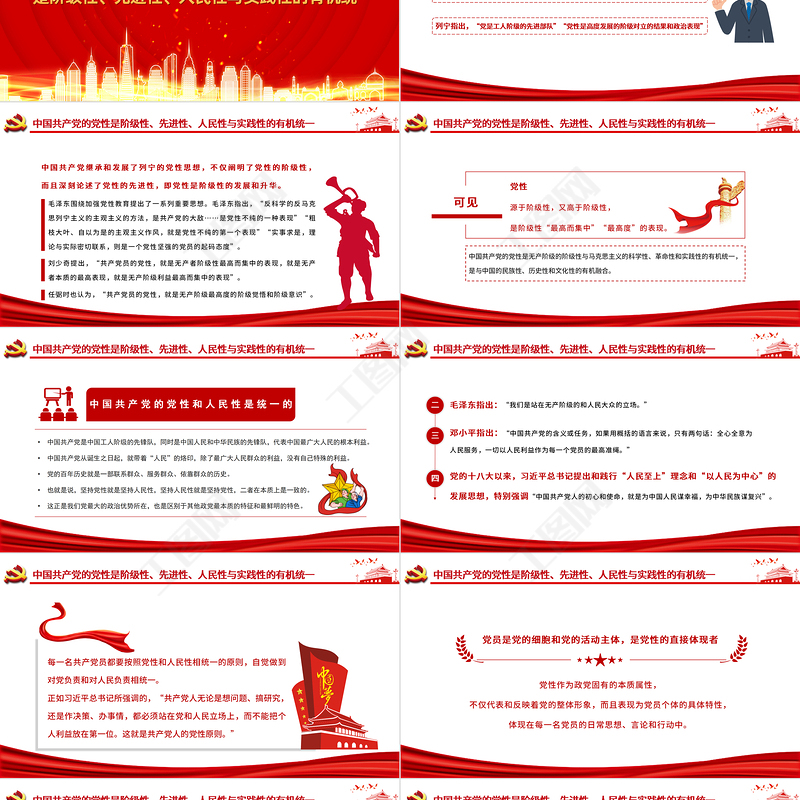 此模板版權(quán)為辦圖網(wǎng)網(wǎng)所有!提示:此PPT為盜版辦圖網(wǎng)網(wǎng)模板,如下載使用,會因兼容問題導(dǎo)致軟件崩潰,請勿下載!!!此模板版權(quán)為辦圖網(wǎng)網(wǎng)所有!提示:此PPT為盜版辦圖網(wǎng)網(wǎng)模板,如下載使用,會因兼容問題導(dǎo)致軟件崩潰,請勿下載!!!中國共產(chǎn)黨的黨性和人民性是統(tǒng)一的中國共產(chǎn)黨是中國工人階級的先鋒隊(duì),同時(shí)是中國人民和中華民族的先鋒隊(duì),代表中國最廣大人民的根本利益。中國共產(chǎn)黨從誕生之日起,就帶著“人民”的烙印,除了最廣大人民群眾的利益,沒有自己特殊的利益。黨的百年歷史就是一部聯(lián)系群眾、服務(wù)群眾、依靠群眾的歷史。也就是說,堅(jiān)持黨性就是堅(jiān)持人民性,堅(jiān)持人民性就是堅(jiān)持黨性,二者在本質(zhì)上是一致的。這正是我們黨最大的政治優(yōu)勢所在,也是區(qū)別于其他政黨最本質(zhì)的特征和最鮮明的特色。中國共產(chǎn)黨的黨性是階級性、先進(jìn)性、人民性與實(shí)踐性的有機(jī)統(tǒng)一