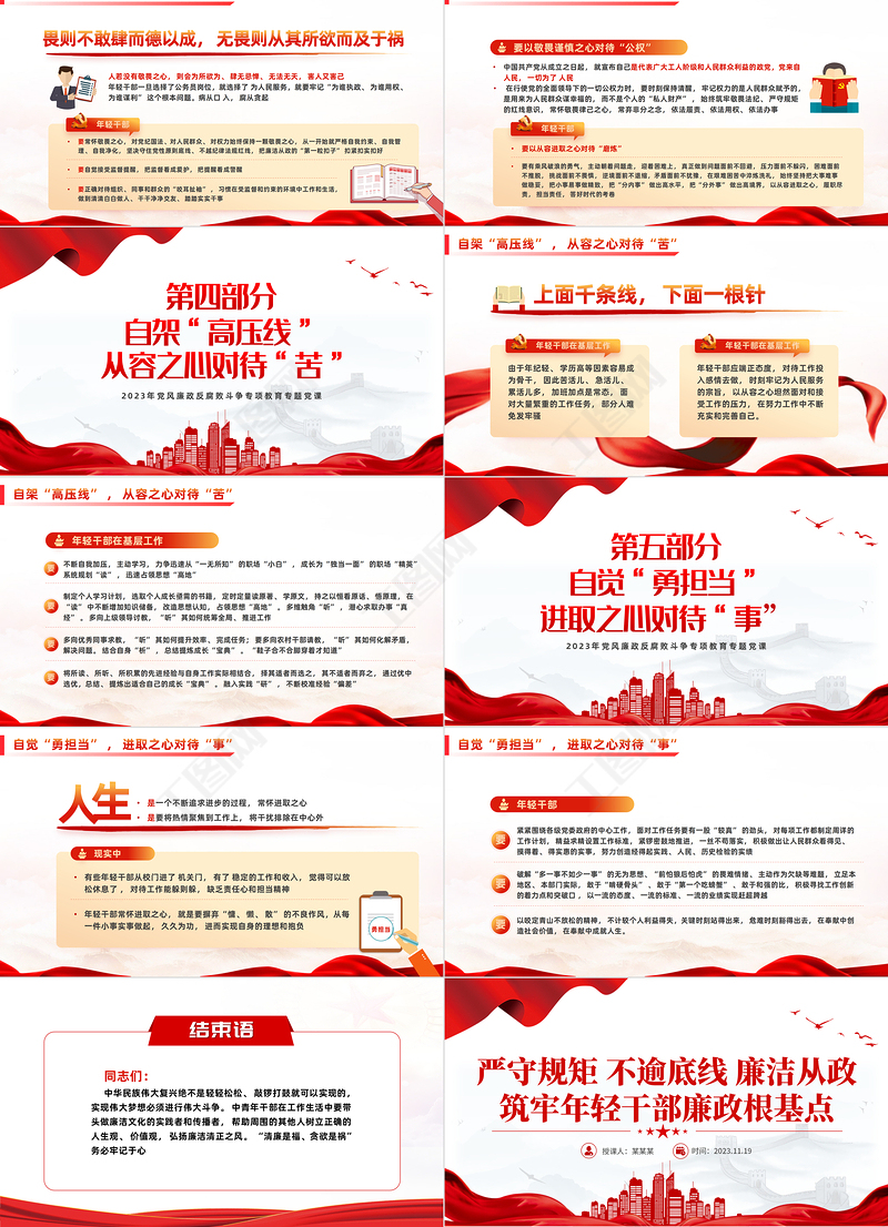 前言導讀同志們: 保持干部隊伍的清正廉潔, 是我們黨經受住執政考驗、 贏得人民群眾擁護的重要保證。 中青年干部如旭日初升, 正是奮發有為的時間。 必須牢記清廉是福、 貪欲是禍的道理, 經常對照黨的理論和路線方針政策、 對照黨章黨規黨紀、 對照初心使命, 看清一些事情該不該做、 能不能干, 時刻自重自省, 嚴守紀法規矩。 在新的時代下, 要緊跟時代步伐, 積極響應黨和國家號召, 真正承擔起新時代的歷史使命和責任, 做反腐倡廉的生力軍, 為新時代注入新的活力、 動力, 努力營造風清氣正的社會氛圍