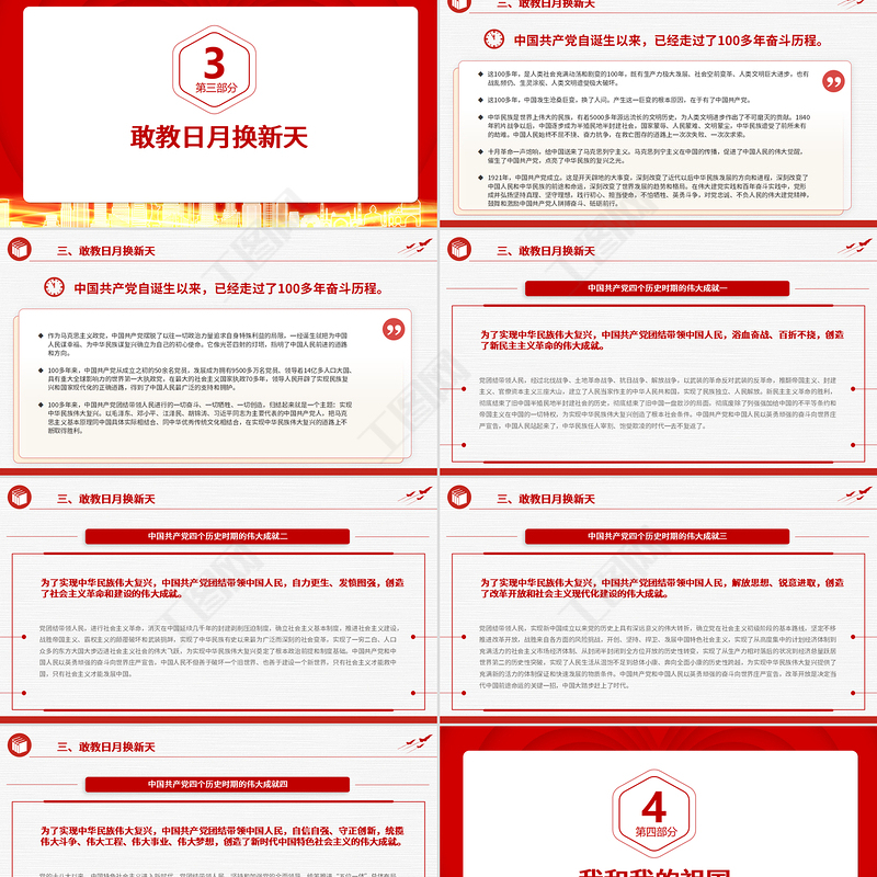 三、敢教日月換新天中國共產黨自誕生以來,已經走過了100多年奮斗歷程。作為馬克思主義政黨,中國共產黨擺脫了以往一切政治力量追求自身特殊利益的局限,一經誕生就把為中國人民謀幸福、為中華民族謀復興確立為自己的初心使命。它像光芒四射的燈塔,指明了中國人民前進的道路和方向。 100多年來,中國共產黨從成立之初的50余名黨員,發展成為擁有9500多萬名黨員、領導著14億多人口大國、具有重大全球影響力的世界第一大執政黨,在最大的社會主義國家執政70多年,領導人民開辟了實現民族復興和國家現代化的正確道路,得到了中國人民最廣泛的支持和擁護。 100多年來,中國共產黨團結帶領人民進行的一切奮斗、一切犧牲、一切創造,歸結起來就是一個主題:實現中華民族偉大復興。以毛澤東、鄧小平、江澤民、胡錦濤、習近平同志為主要代表的中國共產黨人,把馬克思主義基本原理同中國具體實際相結合、同中華優秀傳統文化相結合,在實現中華民族偉大復興的道路上不斷取得勝利。