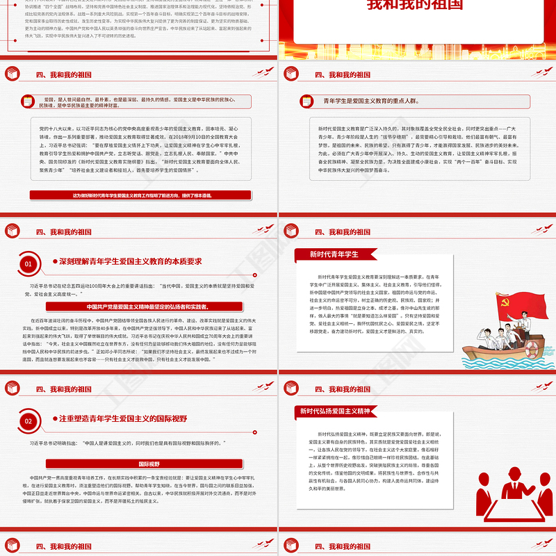 愛國,是人世間最自然、最樸素,也是最深層、最持久的情感。愛國主義是中華民族的民族心、民族魂,是中華民族最主要的精神財富。黨的十八大以來,以習近平同志為核心的黨中央高度重視青少年的愛國主義教育,固本培元、凝心鑄魂,作出一系列重要部署,推動愛國主義教育取得顯著成效。在2018年9月10日的全國教育大會上,習近平總書記強調:“要在厚植愛國主義情懷上下功夫,讓愛國主義精神在學生心中牢牢扎根,教育引導學生熱愛和擁護中國共產黨,立志聽黨話、跟黨走,立志扎根人民、奉獻國家。”中共中央、國務院印發的《新時代愛國主義教育實施綱要》指出,“新時代愛國主義教育要面向全體人民、聚焦青少年”“培養社會主義建設者和接班人,首先要培養學生的愛國情懷”。四、我和我的祖國