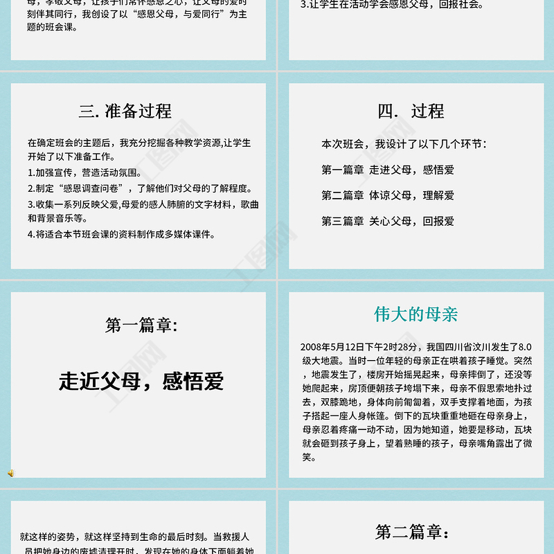 在確定班會(huì)的主題后,我充分挖掘各種教學(xué)資源,讓學(xué)生開(kāi)始了以下準(zhǔn)備工作。1.加強(qiáng)宣傳,營(yíng)造活動(dòng)氛圍。2.制定“感恩調(diào)查問(wèn)卷”,了解他們對(duì)父母的了解程度。3.收集一系列反映父愛(ài),母愛(ài)的感人肺腑的文字材料,歌曲和背景音樂(lè)等。4.將適合本節(jié)班會(huì)課的資料制作成多媒體課件。三. 準(zhǔn)備過(guò)程