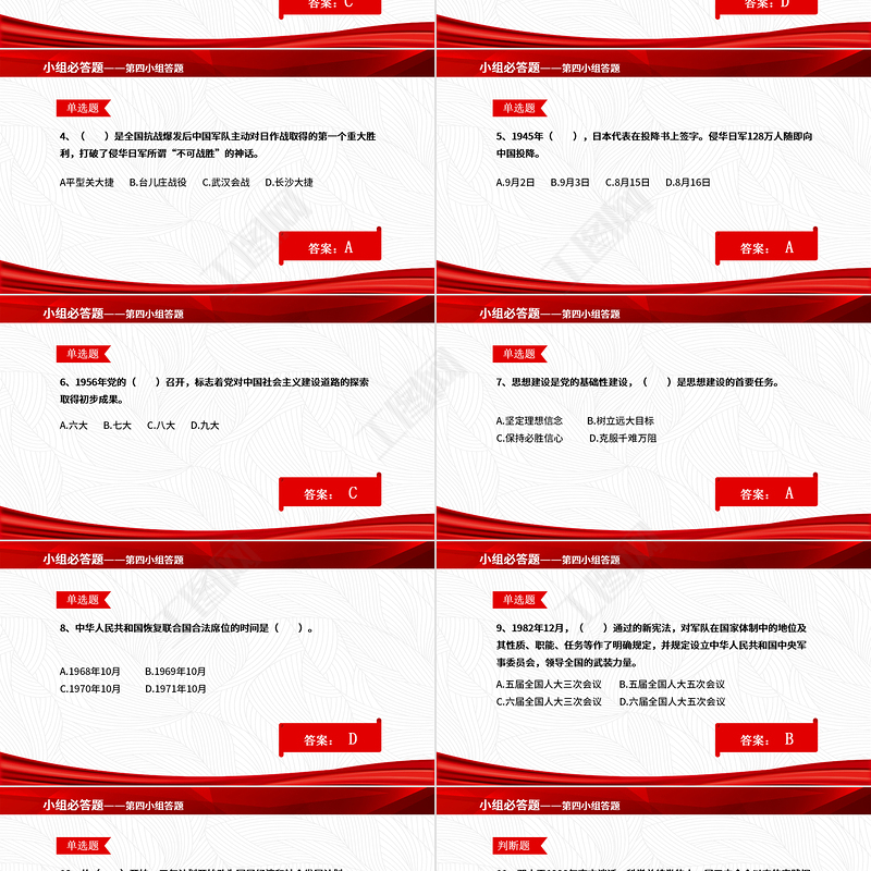4、( )是全國抗戰以來八路軍在華北發動的規模最大、持續時間最長的一次帶戰略性進攻的戰役。A.百團大戰 B.淞滬會戰 C.平津戰役 D.武漢會戰小組必答題——第三小組答題
